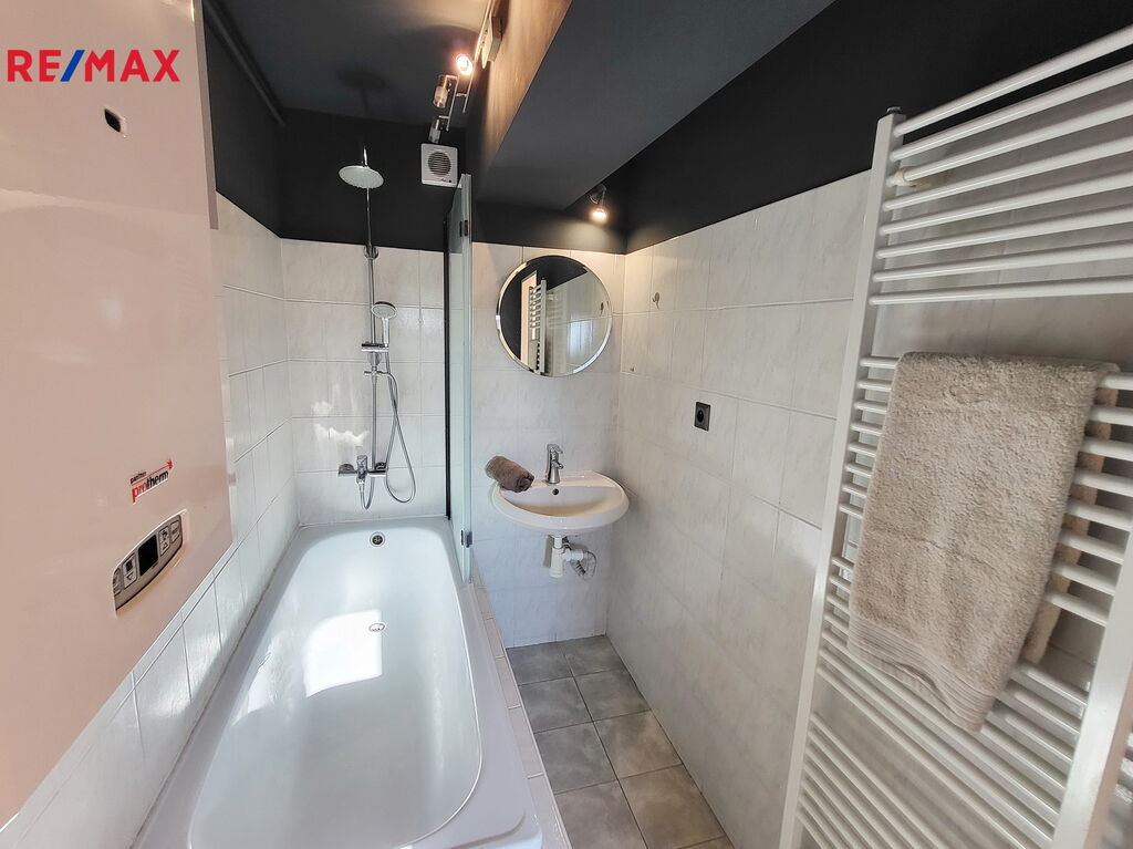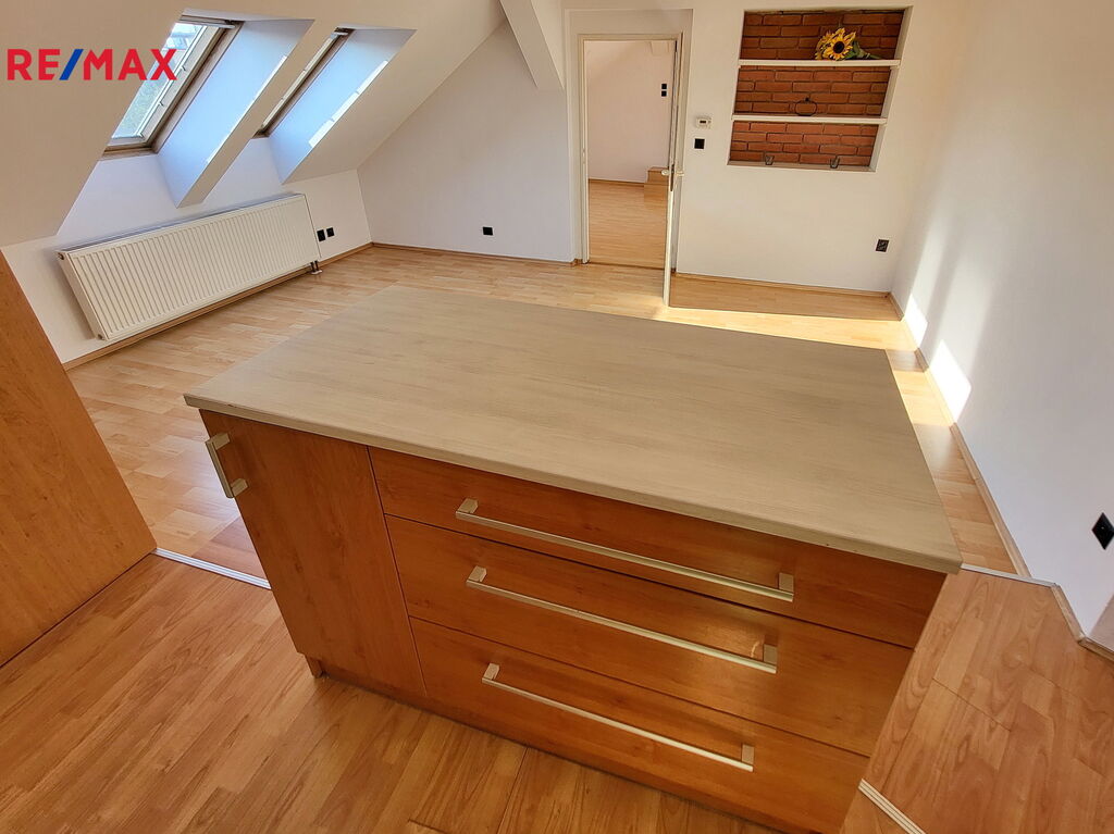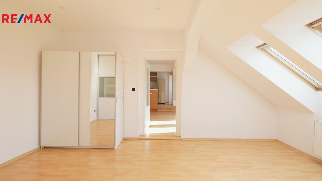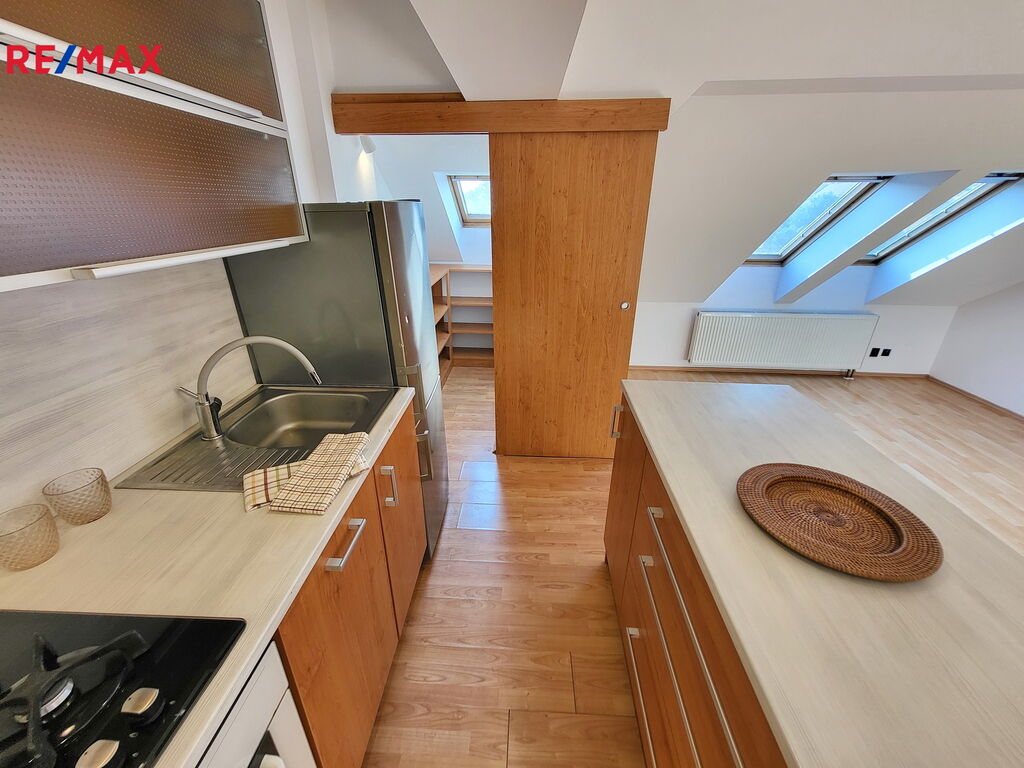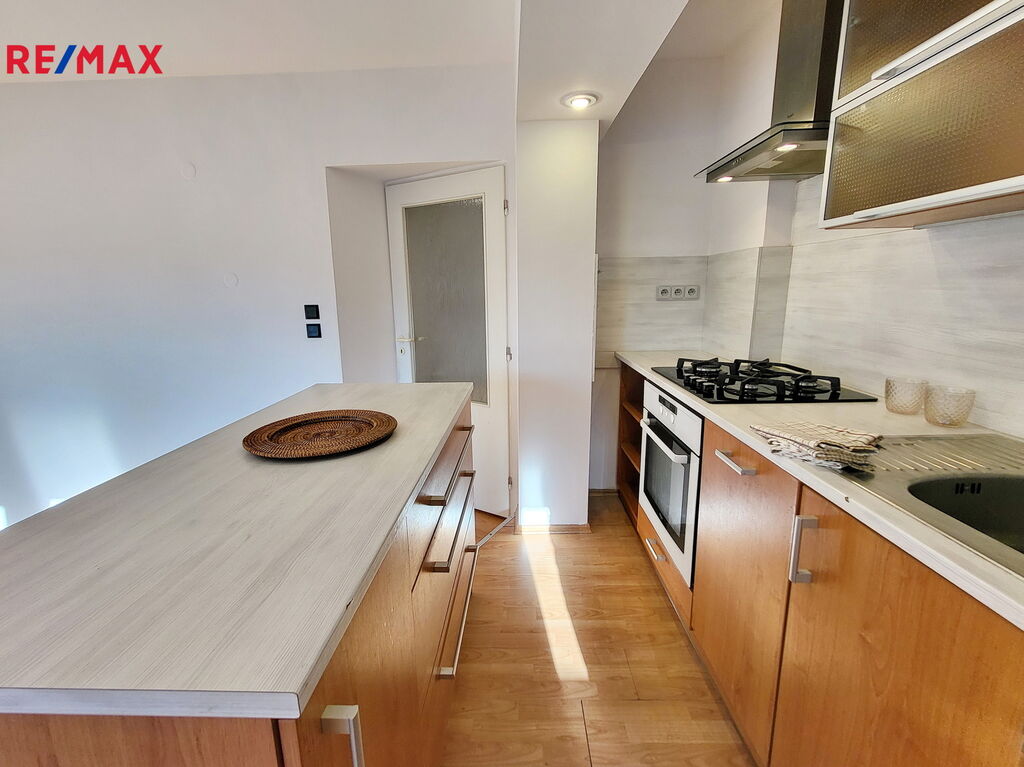 Vstupní chodba do bytu s extra úložným prostorem v podhledu vede do obývací místnosti s kuchyňským koutem. Kychyňský kout stojící na vyvýšeném pódiu je vybavený vestavnou troubou, plynovým sporákem, digestoří a myčkou značky Whirpool. Ostrůvek slouží nejen jako další pracovní plocha, ale je také vybaven oboustranným úložným prostorem se šuplíky. V rohu vedle linky je navíc praktická komora-špajz. Posezení u okna nabízí další úložné prostory. Z obývacího pokoje se dostaneme do ložnice s vestavnou skříní. Na ložnici navazuje koupelna s vanou, místem pro pračku a plynovým kotlem zn. Protherm. Okna v celém bytě směřují na západ.