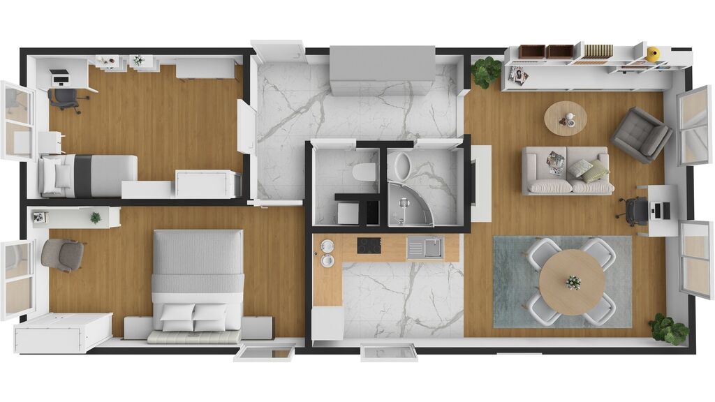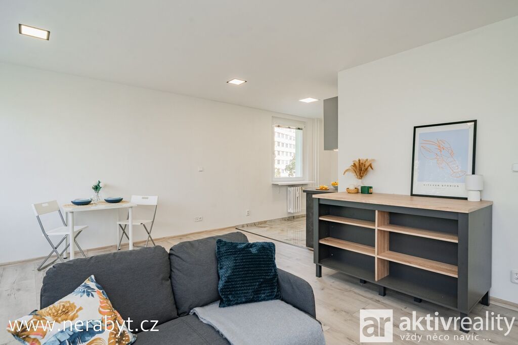 Světlý obývací pokoj je moderně propojen s kuchyňským koutem a nabízí dostatek místa i pro jídelní stůl. Nová Kuchyňská linka je vybavena plynovým sporákem Fagor s digestoří, elektrickou troubou Siguro a má připravený prostor pro myčku.