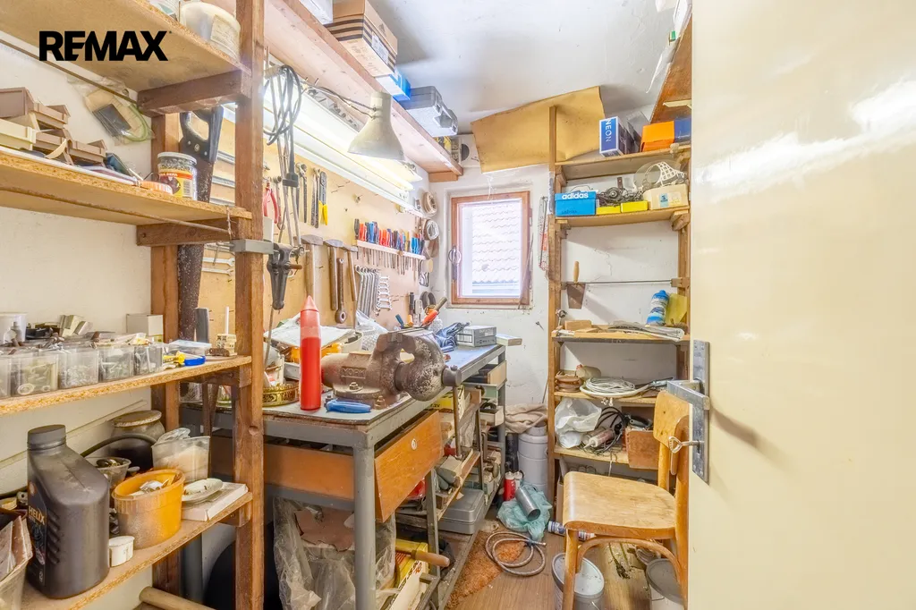 V pravé části domu se nachází původní hospodářská část – kůlna a průjezd do zahrady. Tato část nabízí zajímavý potenciál pro přestavbu na další obytné místnosti, studio s výhledem do zahrady nebo pracovní dílnu.