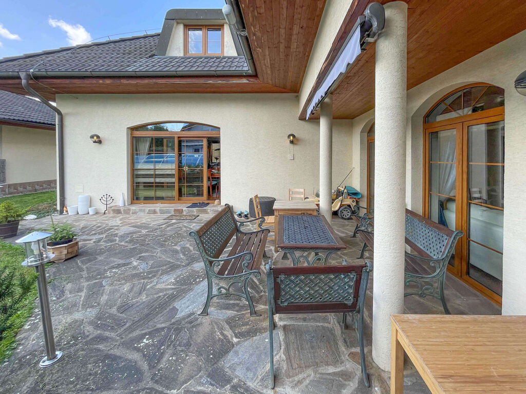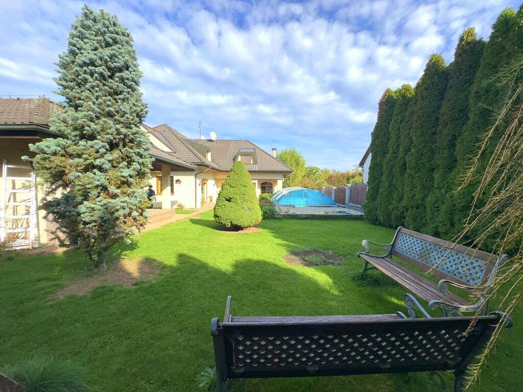 Samostatně stojící dům se vzrostlou zahradou, krytým bazénem s protiproudem a saunou v obci Klínec u Prahy.