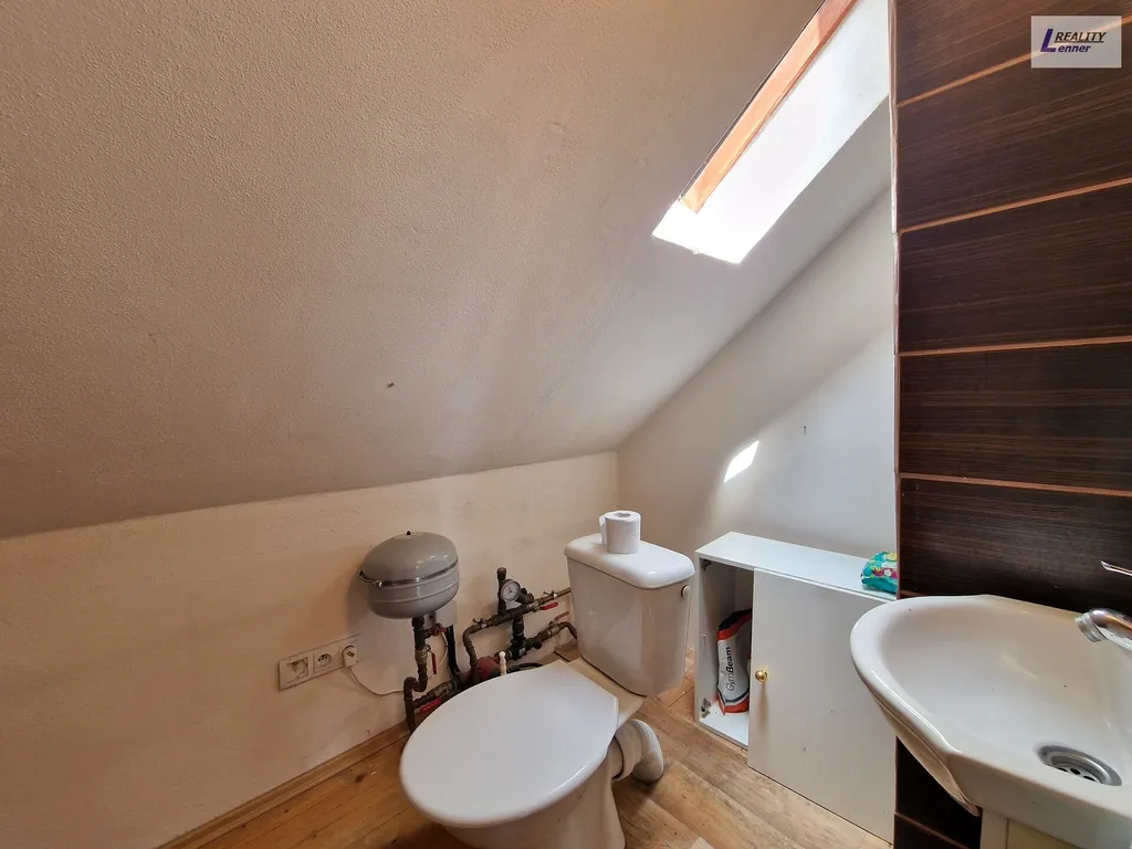V podkroví: chodba, toaleta s umyvadlem, prostorný pokoj (rozdělený sádrokartonovou příčkou na dva dětské pokoje).