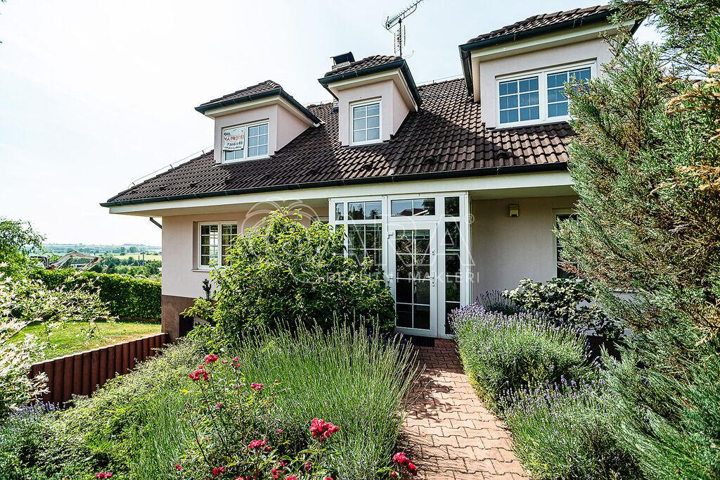 Tato vila z roku 2005 nabízí celkovou užitnou plochu přesahující běžné standardy novostaveb v okolí. Kromě hlavní obytné části je zde také sauna, stylová vinárna v samostatném domku, dva oddělené vstupy a řada úložných prostor včetně šatny a prádelny. Dům je kompletně zařízen nábytkem na míru, který je součástí ceny.