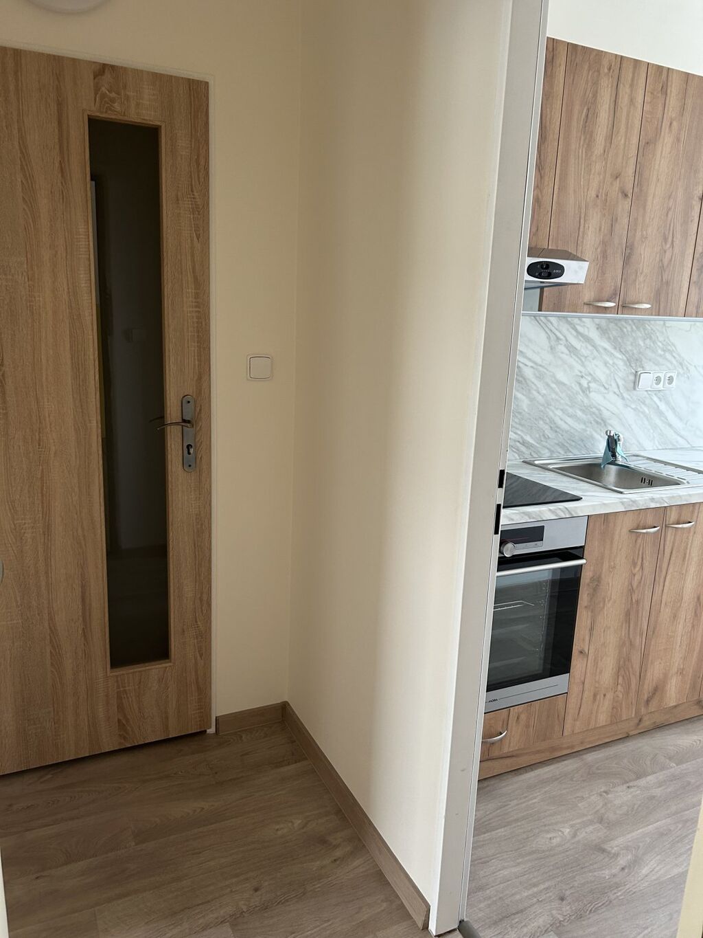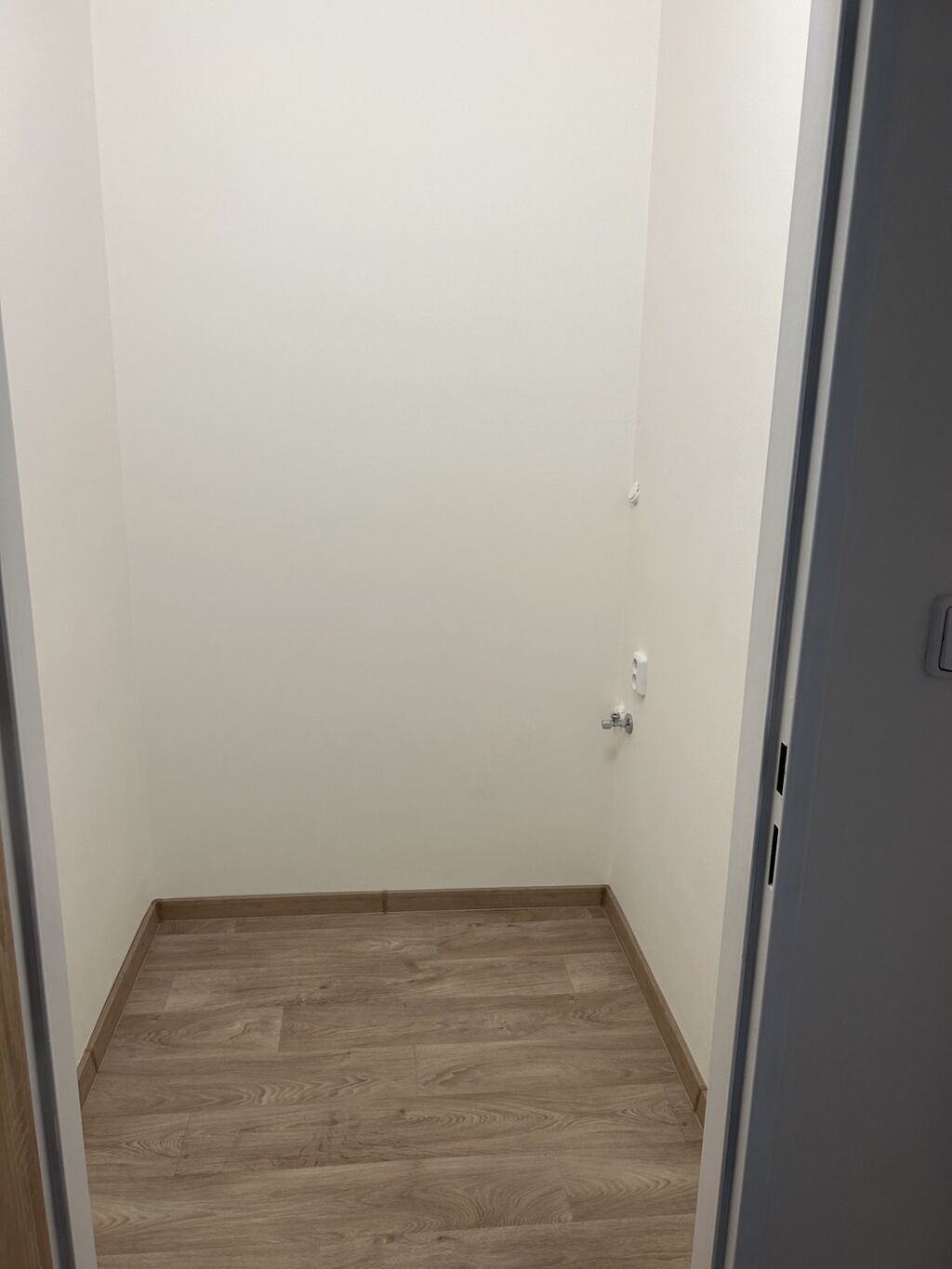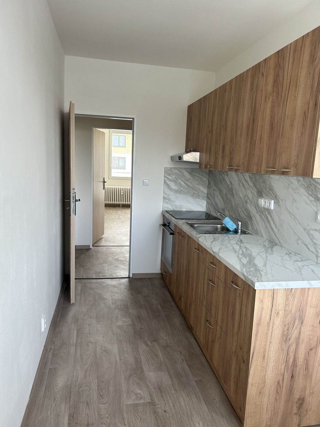 Dispozičně je byt řešen: chodba ze které se vchází rovně do prostorné komory (přípojka na pračku),vlevo vcházíte do obytné místnosti s balkonem a vpravo se z chodby vejde do kuchyně s novou linkou(sporák, lednice, digestoř, dřez) .Z kuchyně vstup do koupelny a WC(sprchový kout, zrcadlová skříňka, umyvadlo s podskříňkou).