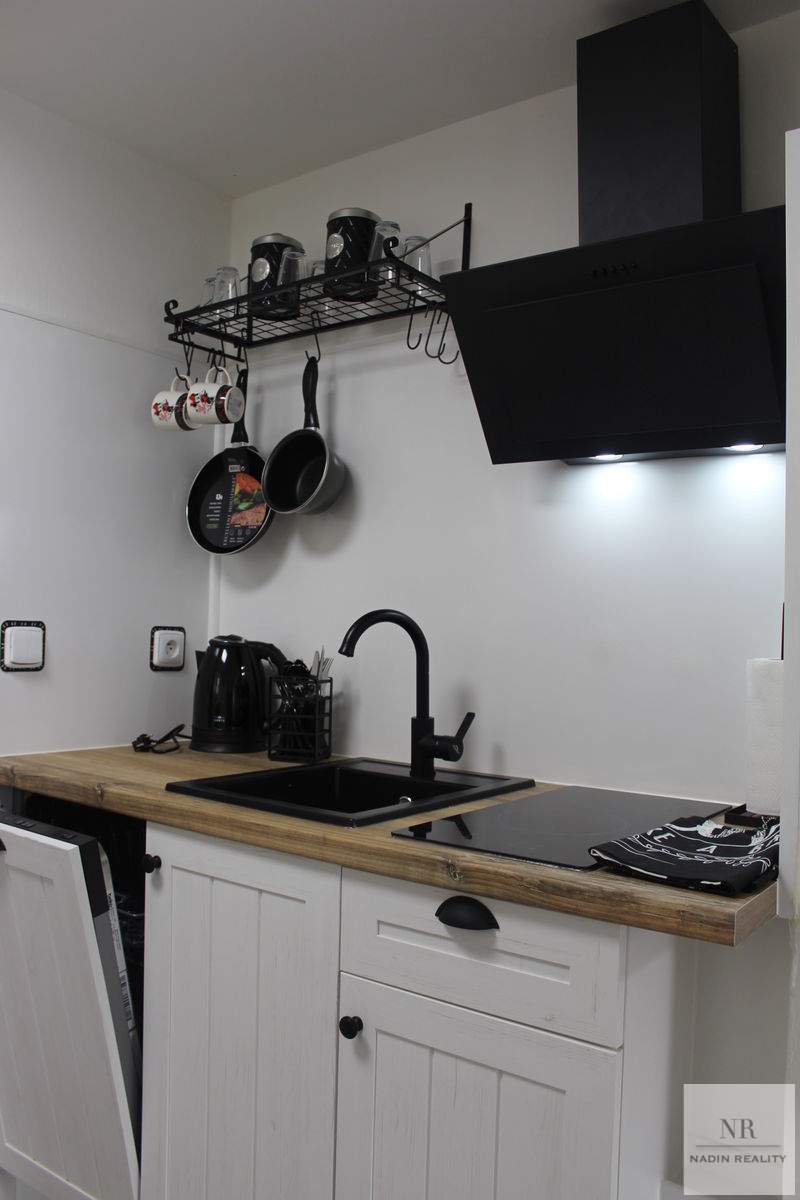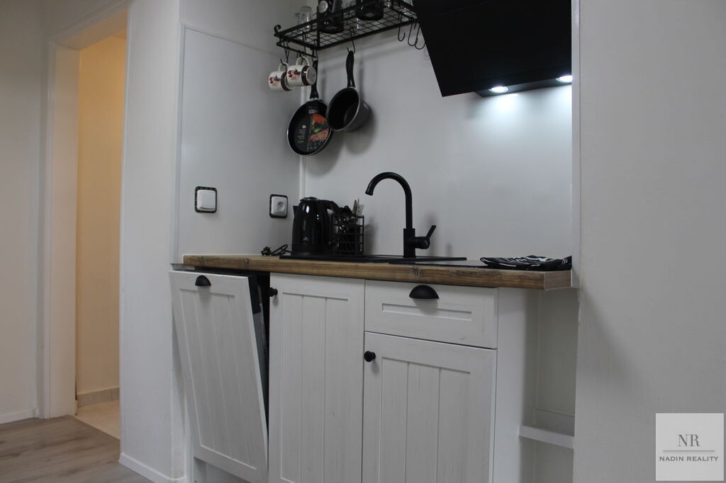 Byt je pronajímán plně vybavený, což zahrnuje kuchyňský kout s vestavnou myčkou, varnou deskou, digestoří, menší chladničkou s mrazákem a mikrovlnnou troubou. V obývacím pokoji se nachází rozkládací pohovka, šatní skříň, stolek a televize, což zajišťuje pohodlné a funkční využití prostoru.