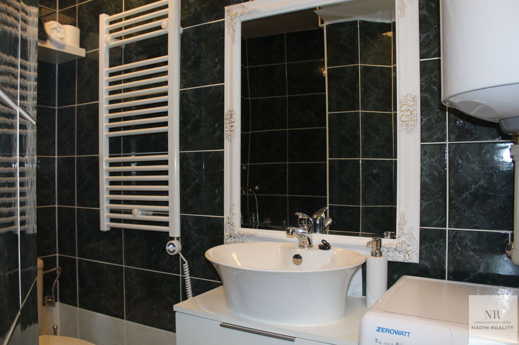 Koupelna je vybavena sprchovým koutem se sedací vaničkou, pračkou a elektrickým bojlerem na ohřev teplé vody. Teplo v bytě je zajišťováno přímotopy, což umožňuje snadnou regulaci teploty podle potřeby.