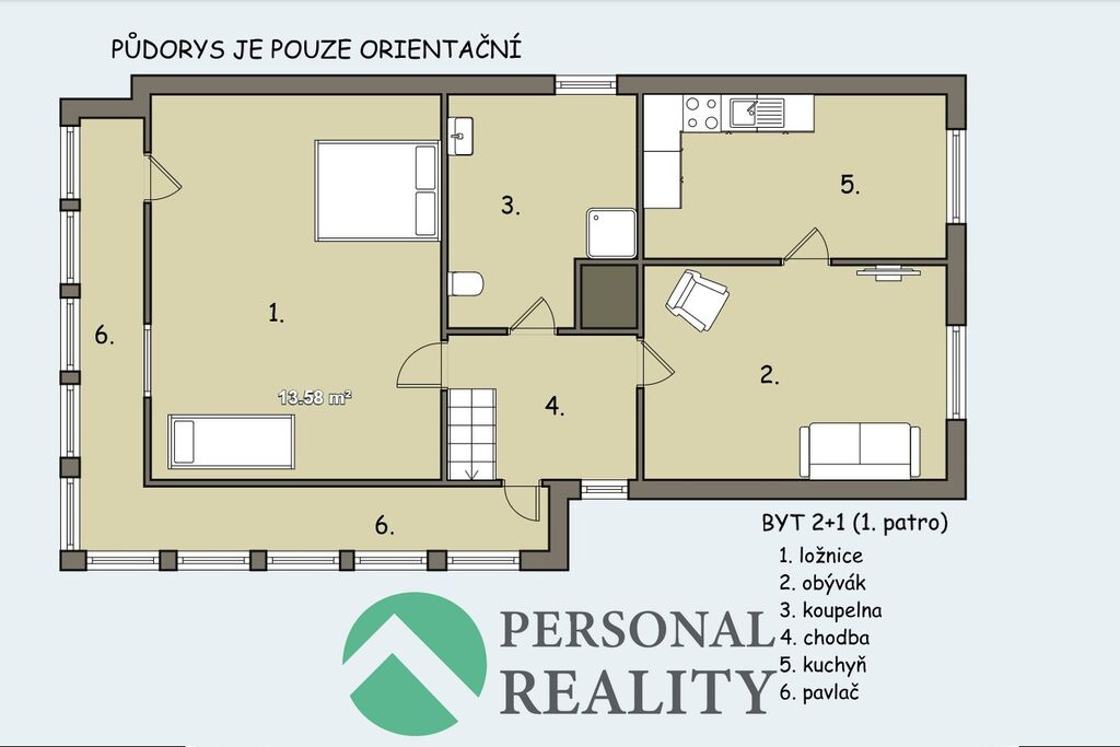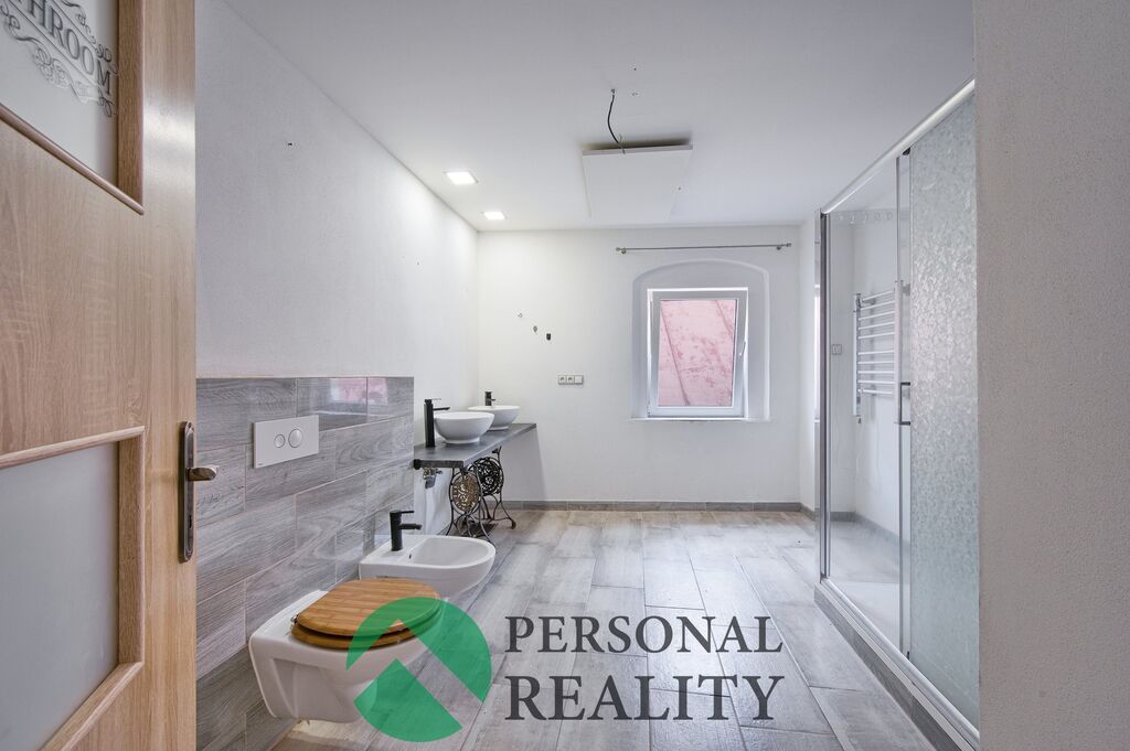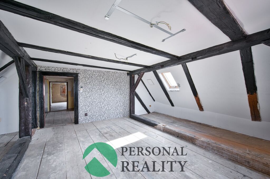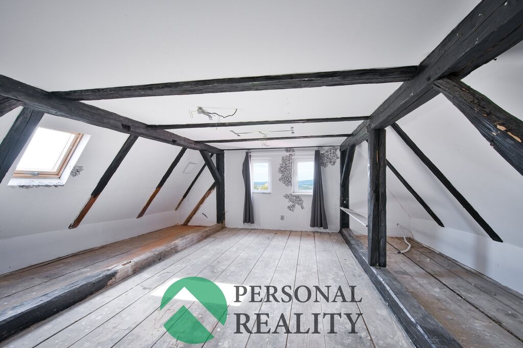 V patře je umístěn prostorný byt 2+1 o velikosti 84 m², který nabízí velkou ložnici, obývací pokoj, kuchyň a koupelnu. Na půdě byl již započat jeden pokoj a je zde možnost rozšíření o další obytný prostor dle představ nového majitele.