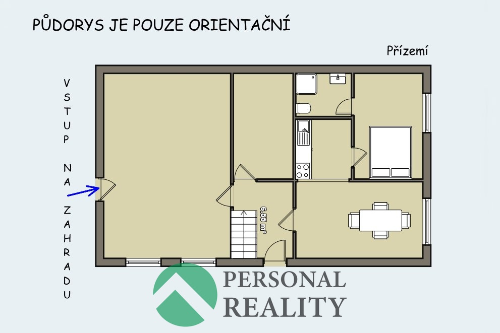 V přízemí domu se nachází bytová jednotka 1+1 se samostatnou koupelnou. Součástí přízemí je také volná místnost se vstupem na zahradu – vhodná například pro vybudování letní kuchyně. Část domu je podsklepená (16 m²).