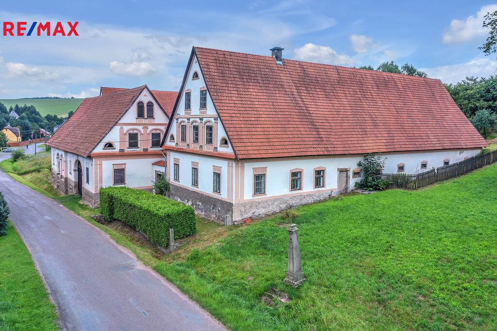 Ve výhradním zastoupení společností RE/MAX Future, Vám tímto nabízíme ke koupi honosný statek, skládající se ze 3 samostatných budov s pozemkem 3 078 m², v obci Heřmánkovice.
