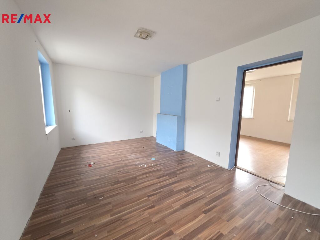 Dispoziční řešení - v přízemí domu se nachází vstupní chodba, prostorný pokoj s kuchyňským koutem a krbovými kamny, menší obytná místnost a koupelna s vanou a toaletou, po dřevěných schodech vyjdeme do patra, kde jsou 4 obytné místnosti a samostatná toaleta. Nově byl instalován elektrický bojler a rozvody elektřiny.