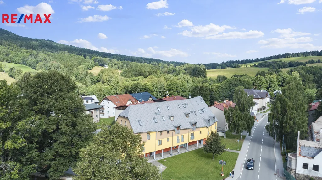 Ve výhradním zastoupení společnosti RE/MAX Future nabízíme k prodeji moc pěkný a prostorný apartmán o dispozici 2+kk, který se nachází v přízemí domu v centu obce Deštné v Orlických horách. Dispozice bytu má následující uspořádání: obývací pokoj s kuchyňským koutem (26,98 m2), pokoj (15,79 m2), chodbu (9,38 m2) a koupelnu s toaletou (6,91 m2). Celková podlahová plocha bytu včetně sklepa je 63 m2, užitná plocha 59 m2. S vlastnictvím bytu je spojeno právo výlučného užívání parkovacího stání přímo u domu a sklepní kóje o velikosti 3,87 m2. Vytápění je řešeno elektrickými přímotopy s možností dálkového ovládání, všechna okna jsou vybavena žaluziemi a venkovními roletami. Byt je vhodný pro vlastní rekreaci nebo bydlení, ale i jako investice na krátkodobé pronájmy.