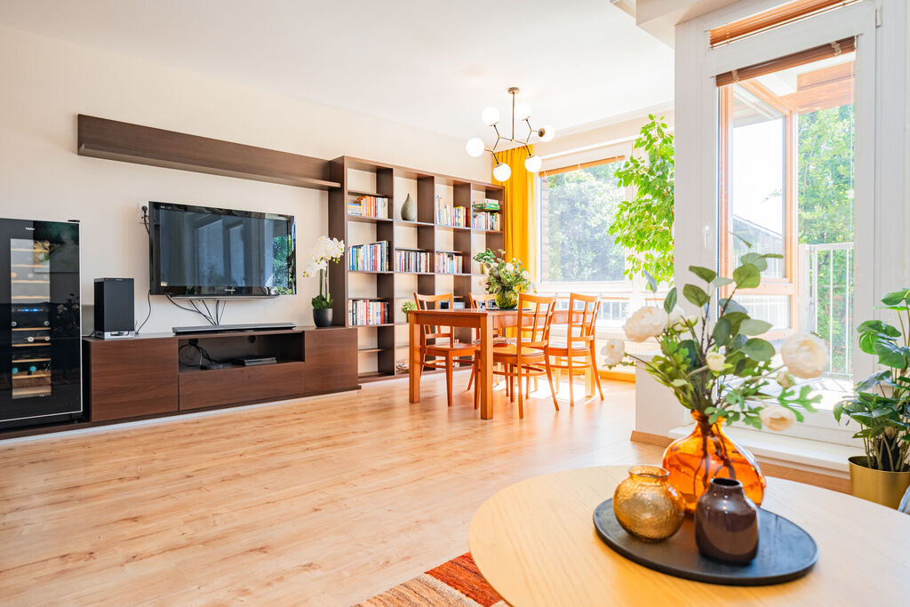 Prostorná dispozice: obývací pokoj se vstupem na lodžii s kuchyňským koutem, tři ložnice, komora i šatna u jedné z ložnic.