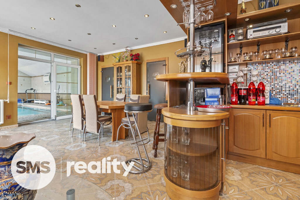 Zahrada o rozloze 766 m² nabízí dostatek soukromí, letní terasu i venkovní krb pro chvíle s rodinou a přáteli. Dominantou nemovitosti je privátní wellness s bazénem, saunou a barem. Celoroční provoz zajišťuje podlahové topení, klimatizace a odvlhčovací systém, částečně napájený fotovoltaikou. Terasa s výhledem do zahrady vytváří dokonalé místo pro relaxaci i společenské večery.