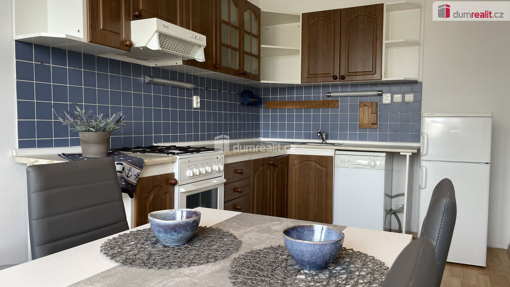 • kuchyňská linka s dřezem, el. troubou, myčkou, ledničkou, stůl se 4 židlemi
