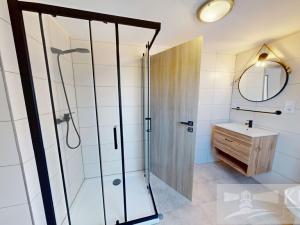 Stylová koupelna: Vybavená sprchovým koutem a místem pro pračku i sušičku.