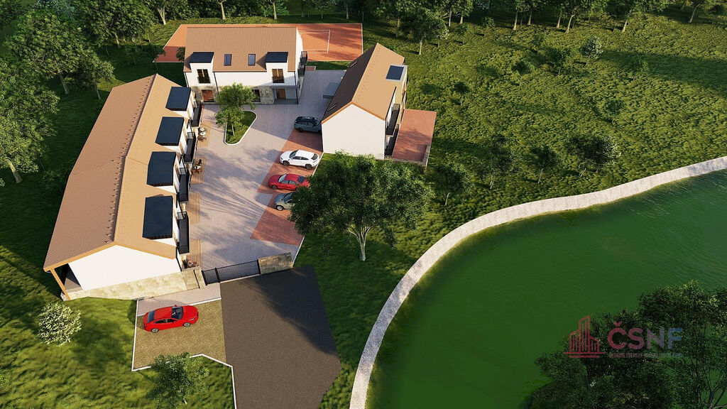 Jedná se o krásný malý komorní projekt v uzavřeném areálu kde se postaví tři samostatné apartmánové domy. Součástí tohoto areálu bude také malý rybník a venkovní parkovací stání.