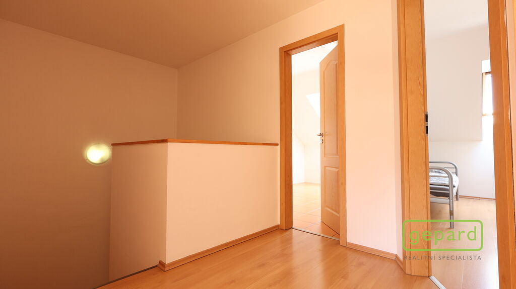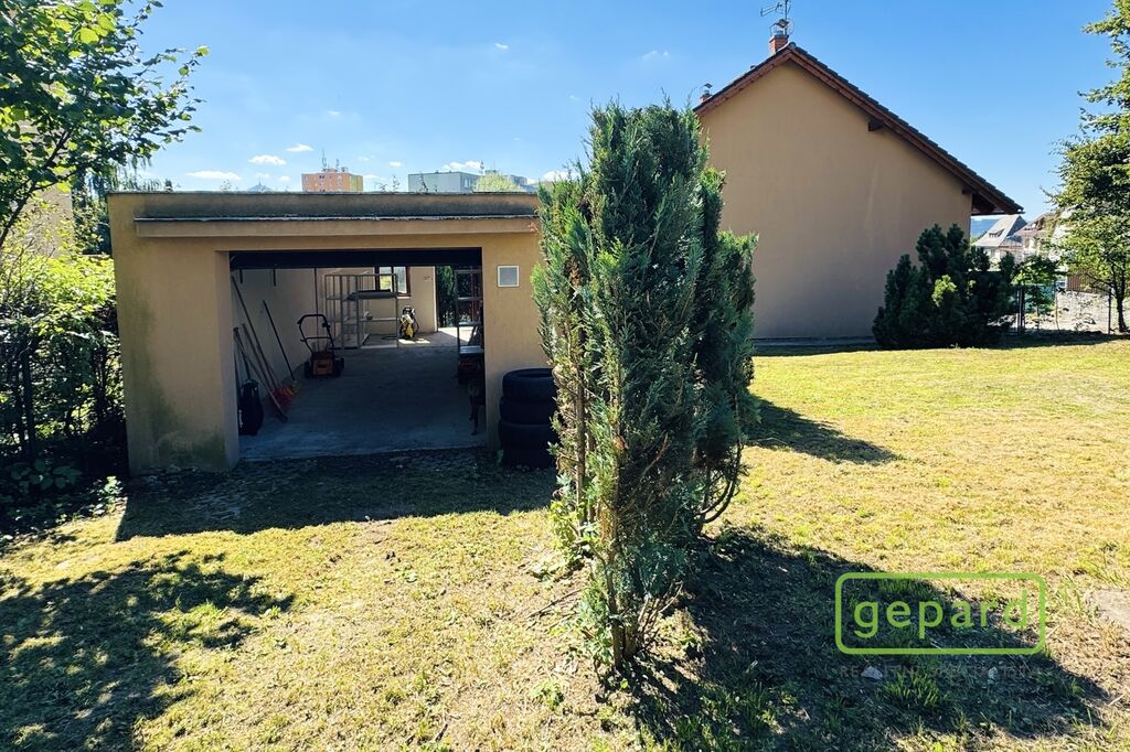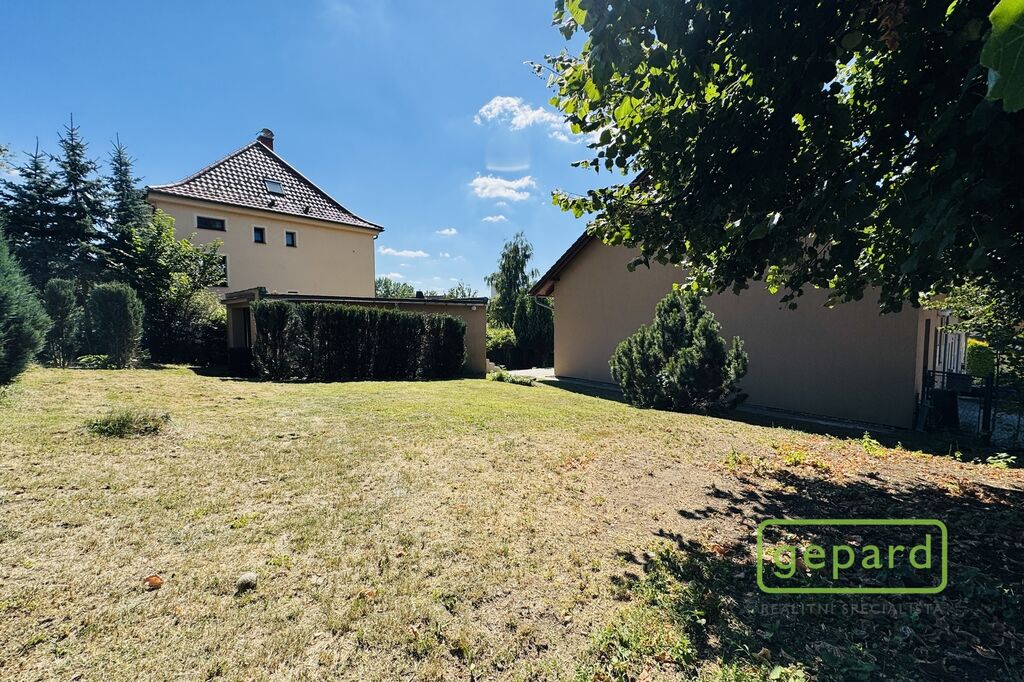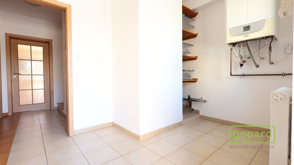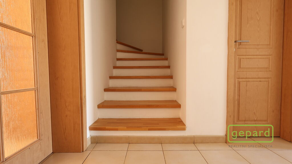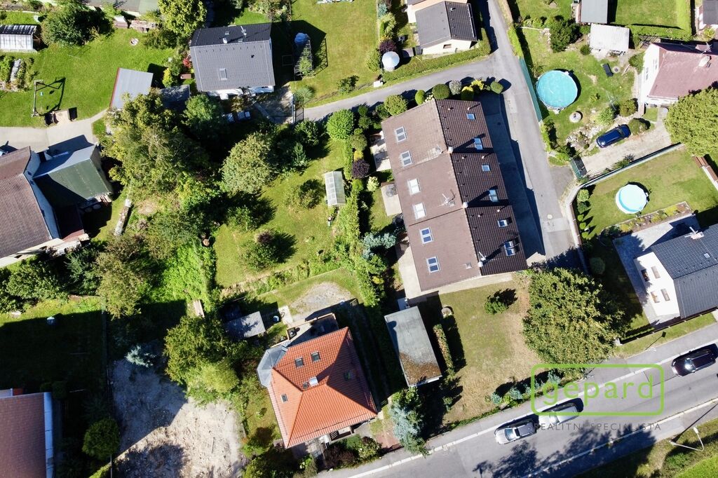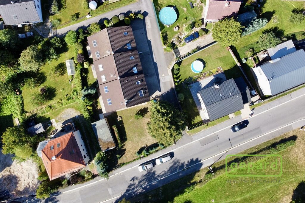 Dům je řadový-krajní, takže k němu z boku náleží i prostorná zahrada s kopanou studnou a zděnou garáží, kde je i prostor pro uskladnění věcí. Hlavní vchod je z ulice, kde máte parkovací místo ještě pro dva vozy. Ze zahrady vede zadní vchod přímo do obývacího pokoje s kuchyňskou linkou a spižírnou, dále se nachází místnost vhodná např. jako ložnice, velká šatna nebo pracovna. Toto spodní patro má i vlastní WC s umyvadlem a sprchovým koutem a vstupní chodbu u hl.vchodu do domu ve které se skrývá i kondenzační plynový kotel. Do patra vede dřevěné schodiště a nahoře jsou 3 velké pokoje a koupelna s WC a rohovou vanou. Z prostředního pokoje je výstup na půdu, která poskytuje další místo na uskladnění.
