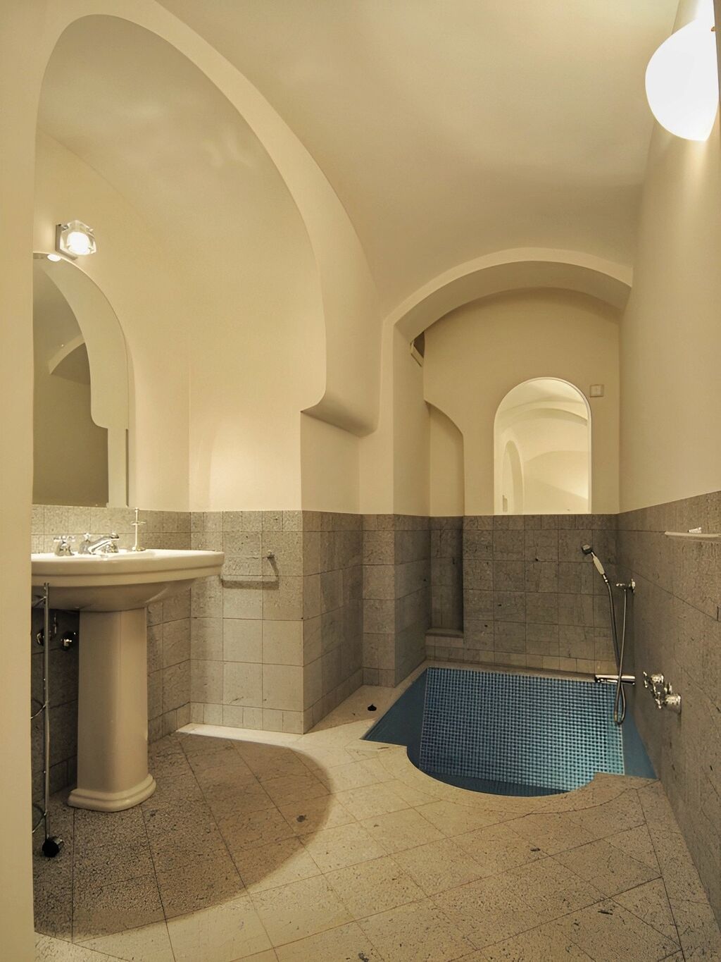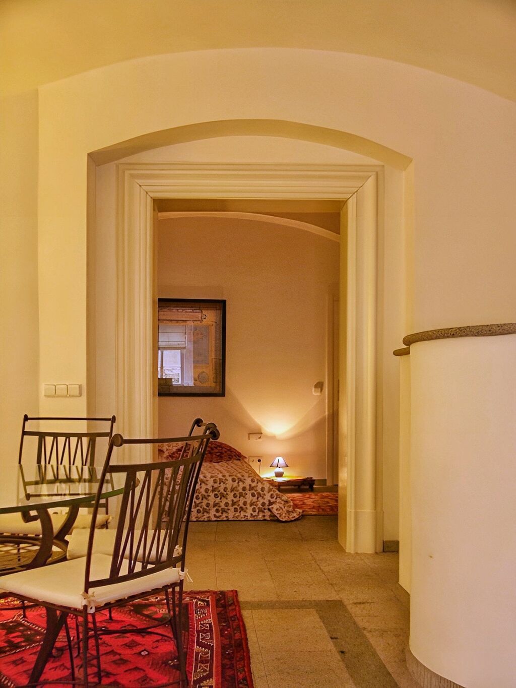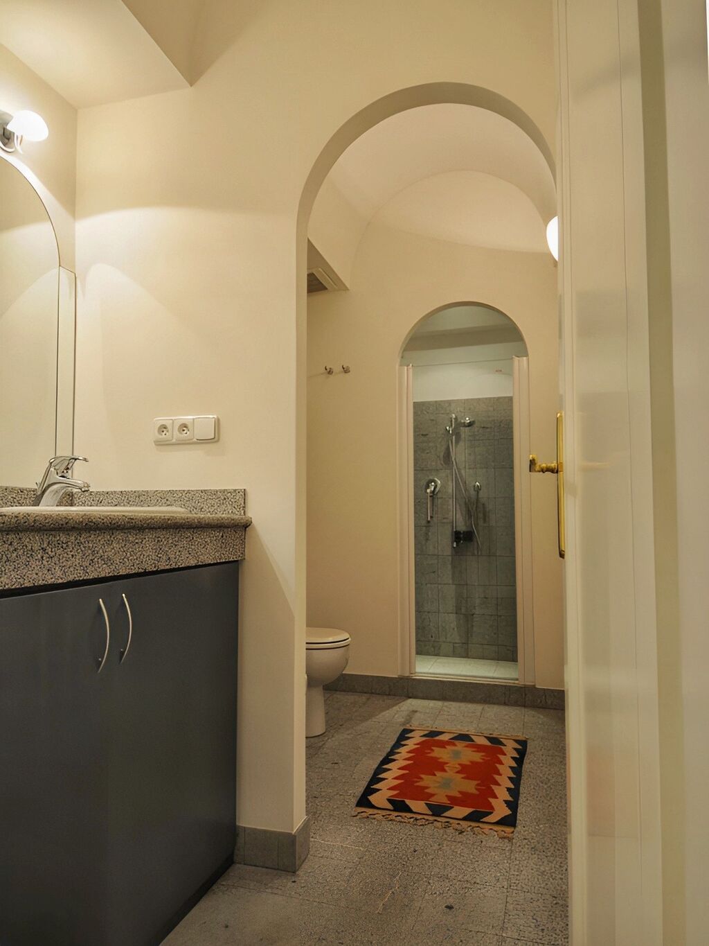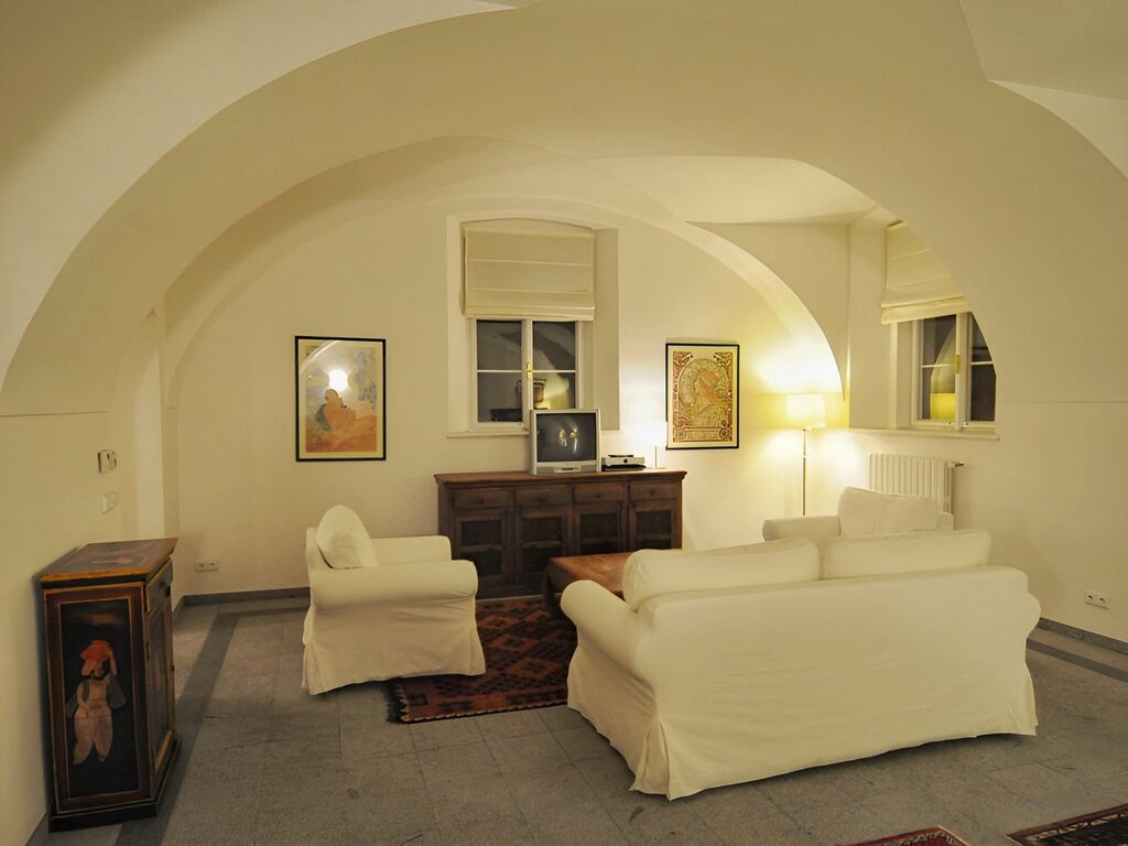 Byt o celkové ploše 92 m2 se skládá z velkého obývacího pokoje s jídelnou, plně zařízené kuchyní, ložnici, luxusní koupelny, vestavěné šatny a komory. Byt je plně vybavený a je vhodný pro 2 dospělé osoby. Vchod do bytu je možný z malé soukromé zahrady o velikosti 20 m², situované směrem do společného dvora se stromy a kašnou. Dále vchod pokračuje do velké vstupní haly s renesančními klenbami. Z haly se dostáme do obývacího pokoje, který směruje do jídelny o rozměru 47 m2 s dvojitými renesančními klenbami. V obývacím pokoji je umístěna rozkládací pohovka pro dvě osoby, satelitní TV. Dále v bytě je pěkná kuchyň, komora, ložnice 17 m2 a šatna. Ložnice se nachází vstup do nádherné koupelny s kulatou vanou.