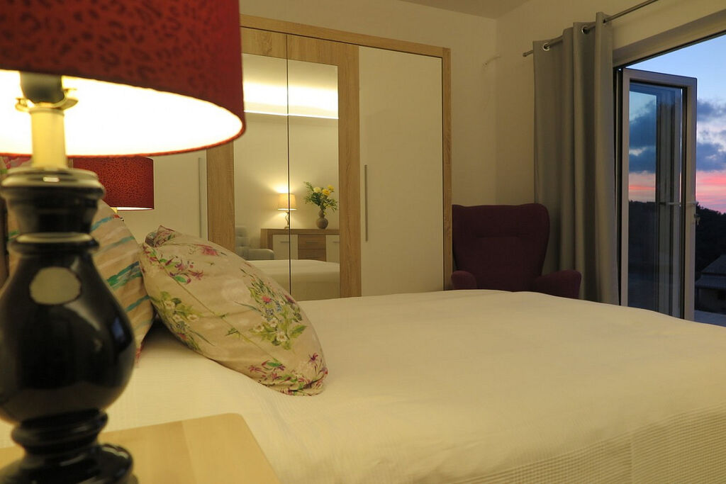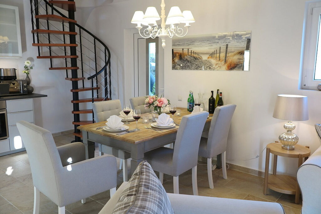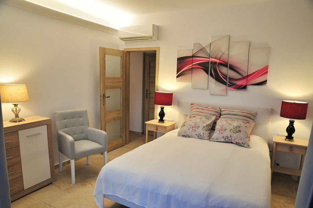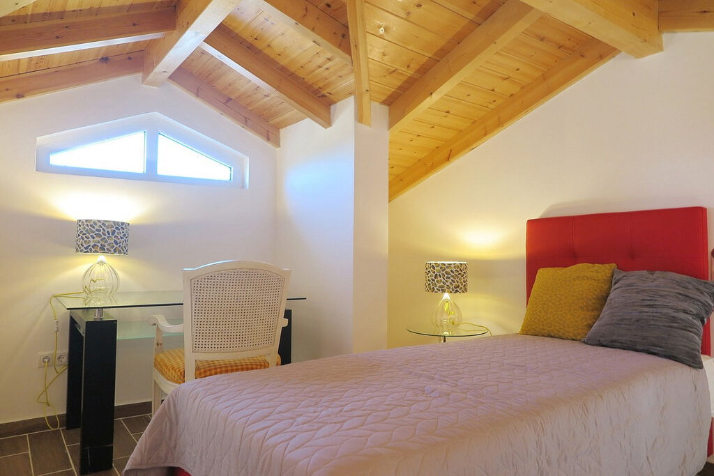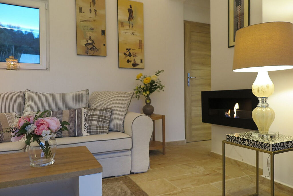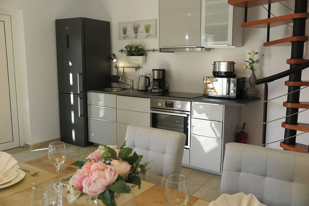 Otevřená kuchyň, plně vybavená s vestavěnou troubou a myčkou. Velké terasové skleněné dveře z přízemního pokoje vedou na vydlážděnou přírodním kamenem terasu s bazénem a altánem, kde je další jídelní a relaxační zóna. Moderní koupelny s velmi pohodlným sprchovým koutem, ložnice s výhledem na moře jsou vybavené nábytkem včetně vystavených skříni. Útulné podkroví, které lze použít jako další ložnice, kancelář nebo cokoli jiného.