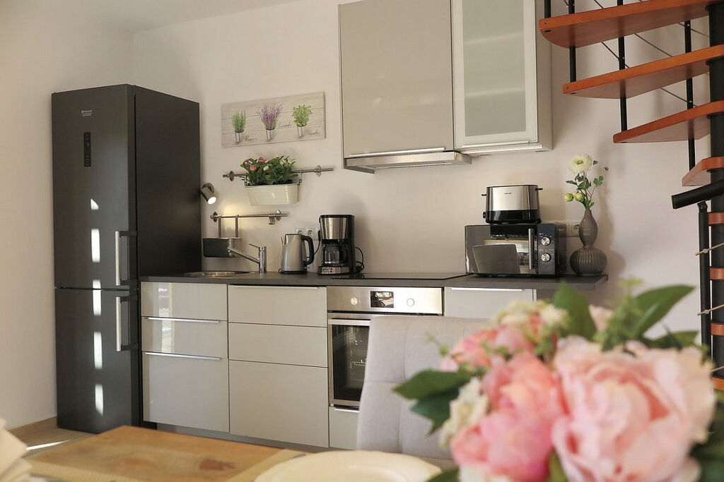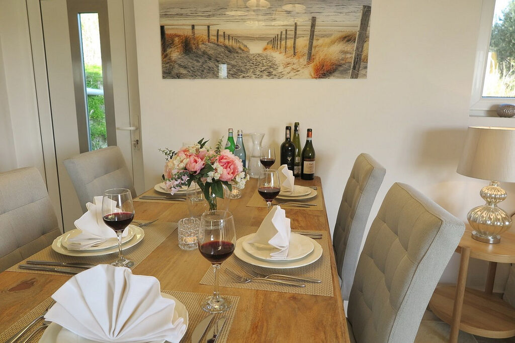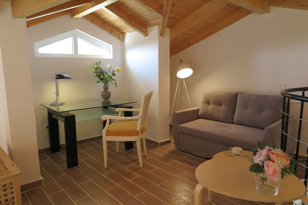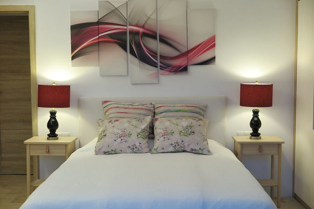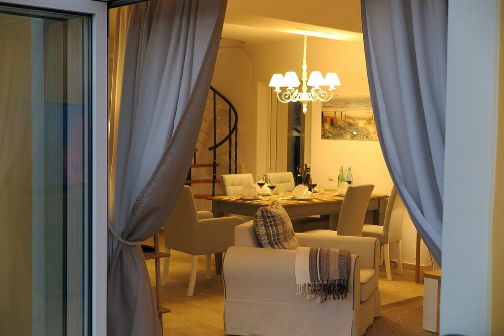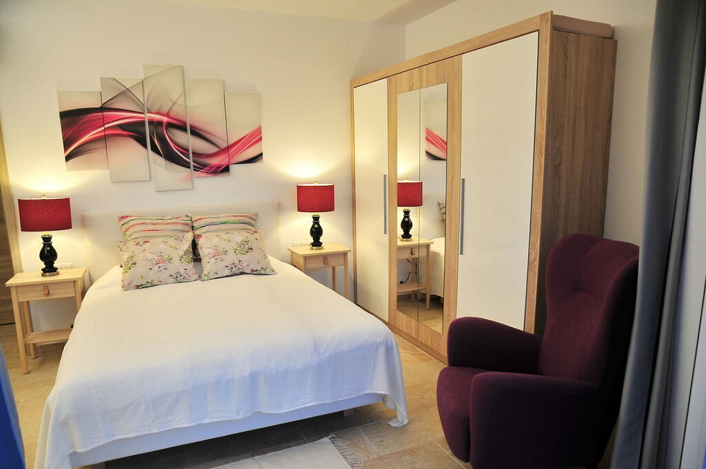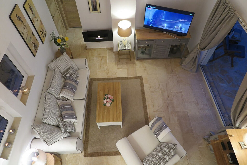 Otevřená kuchyň, plně vybavená s vestavěnou troubou a myčkou. Velké terasové skleněné dveře z přízemního pokoje vedou na vydlážděnou přírodním kamenem terasu s bazénem a altánem, kde je další jídelní a relaxační zóna. Moderní koupelny s velmi pohodlným sprchovým koutem, ložnice s výhledem na moře jsou vybavené nábytkem včetně vystavených skříni. Útulné podkroví, které lze použít jako další ložnice, kancelář nebo cokoli jiného.