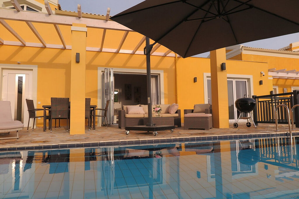 Na zahradě je útulné posezení pod pergolou. Soukromé parkovací místo je před domem, trávník s automatickým zavlažováním a zadní zahrady. Dům je vybaven nejmodernějším systémem tepelných čerpadel, které zajišťují vytápění i chlazení velmi ekonomickým a ekologickým způsobem. K dispozici je také obrovská vodní nádrž na 45 000 litrů, která zajišťuje autonomii vody. Jsou zde rozvody pro internet, kabelovou a satelitní TV, domácí kino a bezpečnostní systém s kamerami.