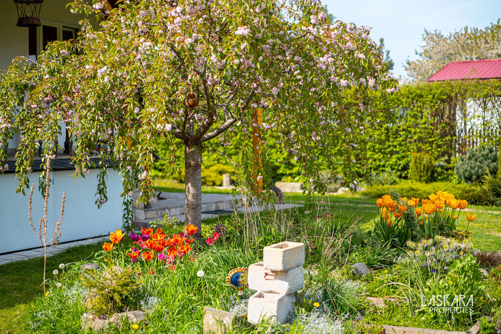 Rovinatý krásný pozemek má velikost 2380 m², zahrada je plná vzrostlých stromů a okrasnou zelení. Z jedné strany pozemek lemuje malý potůček, který přitéká do blízkého malebného rybníku.