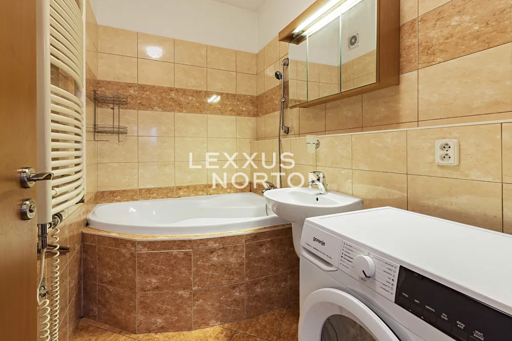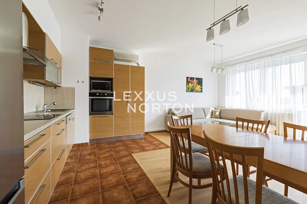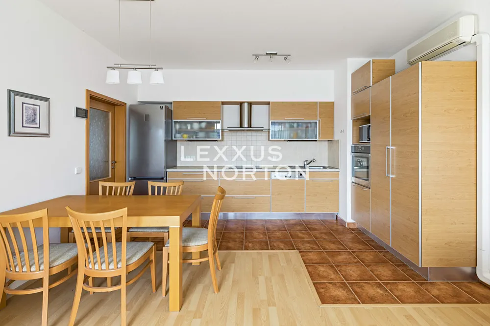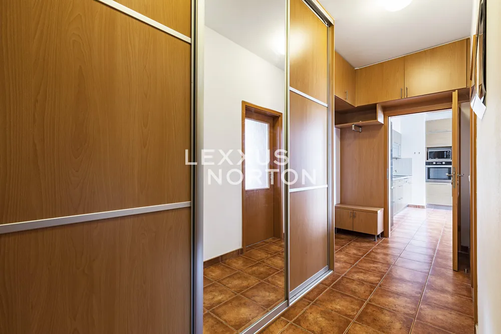 Byt je vybaven kuchyňskou linkou včetně spotřebičů, klimatizace, na terase markýza. Na podlaze plovoucí podlahy a dlažba, dřevěné interiérové dveře s obložkami, okna plastová. V bytě jsou na míru řešené vestavěné skříně, v některých místnostech jsou využity i horní části, podhledy a výklenky. Byt má vyšší stropy(2,75 m). Byt má šikovné dispoziční řešení a dostatek úložného prostoru.