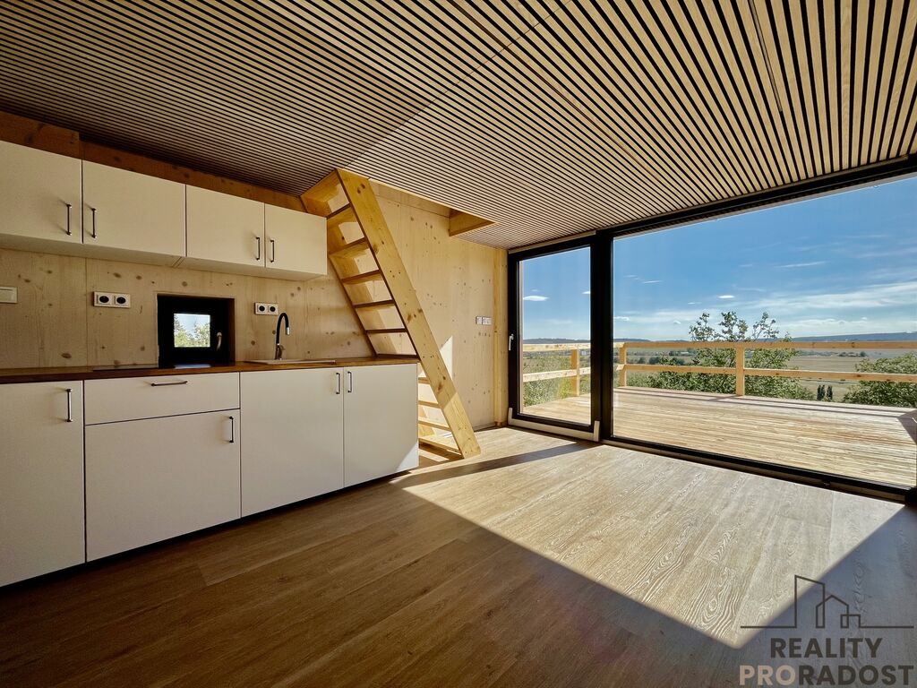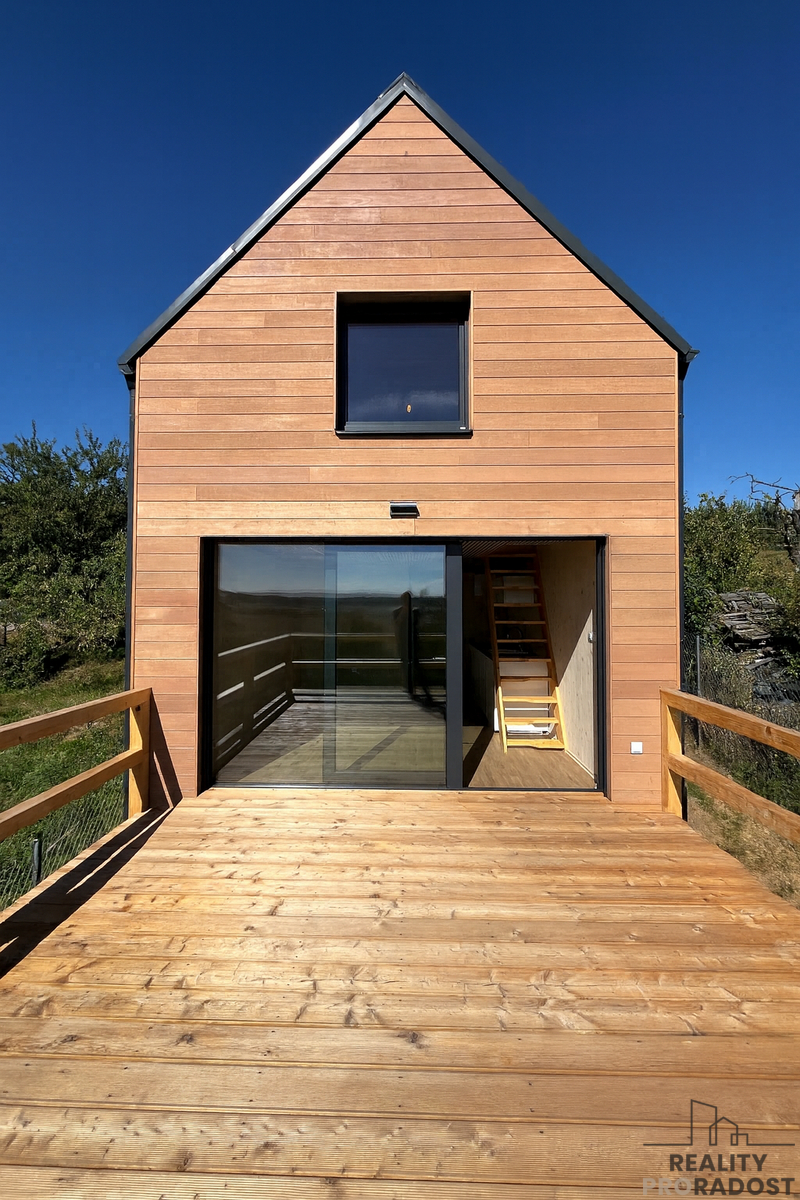 Na pozemku o rozloze 1000 m² stojí chata s užitnou plochou 47 m², promyšlená do posledního detailu pro minimalistické a zároveň pohodlné celoroční bydlení. Z obývacího prostoru vstoupíte přímo na velkou terasu, odkud se otevírá nerušený výhled do krajiny. Ráno vás probudí slunce díky jižní orientaci, večer si vychutnáte západy v naprostém soukromí.