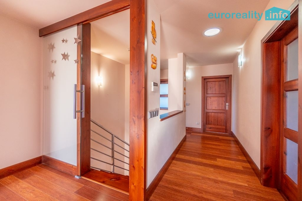 Dispozice přízemí tvoří vstupní chodba, koupelna se sprchou a WC, vstup do garáže, prostorný obývací pokoj s kuchyní a jídelnou se vstupem na zahradu a pracovna s přístupem do dílny (nyní truhlárna, možnost úpravy na obytný prostor). V podkroví se nachází čtyři pokoje, ložnice s šatnou, koupelna s vanou a WC a technická místnost. Součástí je také velká zateplená půda, kterou lze využít jako hernu, úložné prostory nebo další obytnou část.