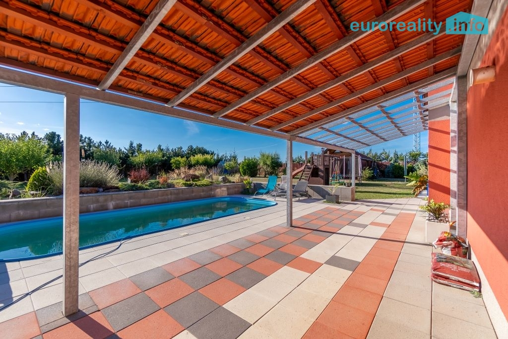 Zahrada o výměře 1 718 m² je rovinatá, oplocená a pečlivě udržovaná. Najdete zde venkovní bazén, okrasné jezírko s rybami, skalku, ovocné i okrasné stromy a keře. Součástí je zahradní domek a samonosná pojezdová vrata pro pohodlný vjezd.