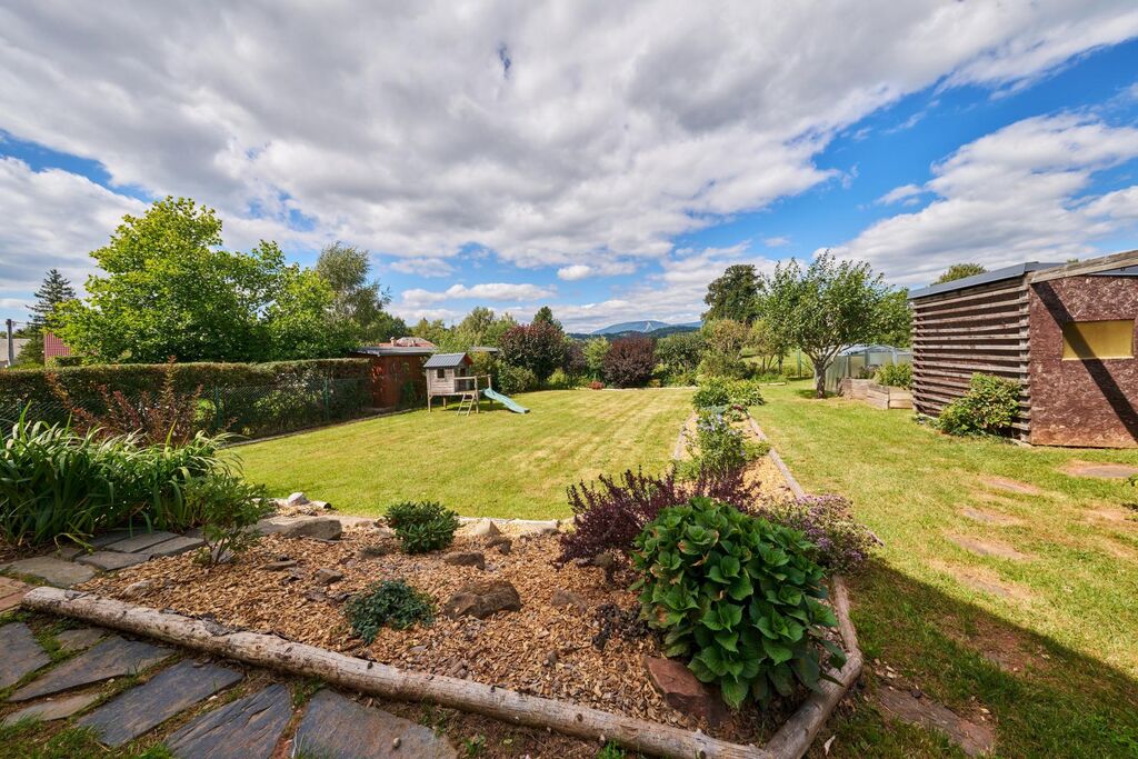 Pozemek je o celkové výměře 925 m2, je rovinatý, oplocen, v přední části s podezdívkou a kovaným plotem s vjezdovou bránou a brankou. Za domem s výhledem na Černou horu je umístěna zahrada. Tato je pečlivě udržovaná, s pěkným trávníkem a množstvím vysázených ovocných a okrasných stromů a keřů. K využití je též přístřešek, dřevěná kolna či velký skleník ad.