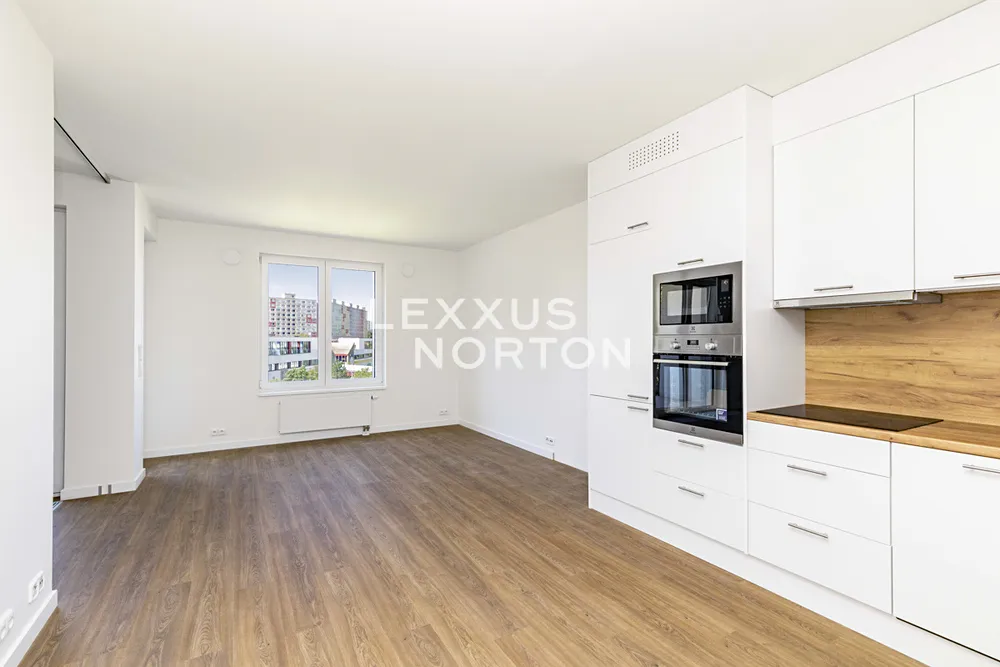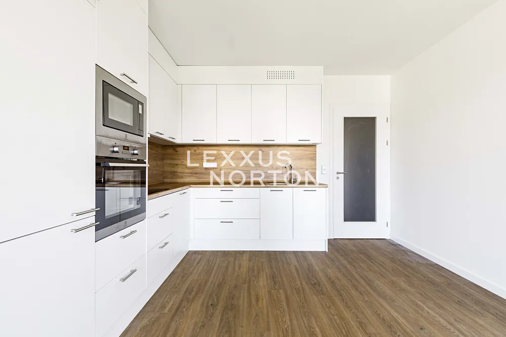 Ve 3. patře rezidenčního komplexu s výtahem je situován tento světlý, disponující vstupní chodbou ze které se lze přesunout do obývacího pokoje s plně vybaveným kuchyňským koutem (indukční deska, trouba, lednice, mrazák, myčka nádobí) včetně jídelního prostoru, dále do ložnice s přímým vstupem na lodžii. V neposlední řadě je součástí bytu koupelna s vanou a komora. V ceně nájemného je zahrnut sklep a garážové parkovací stání. Součástí vybavení jsou vestavěné skříně.