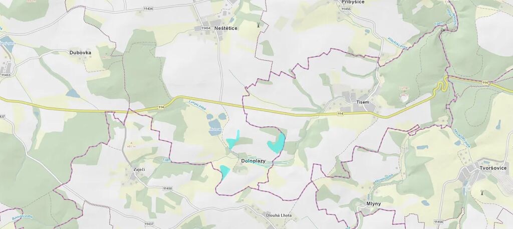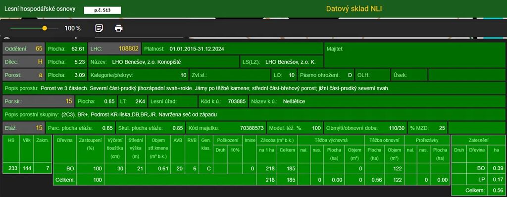 Jedná se o p.č. 513 vedená jako lesní pozemek o celkové výměře 11 060 m2, vlastníme podíl 1/8 tudíž 1 383 m2,