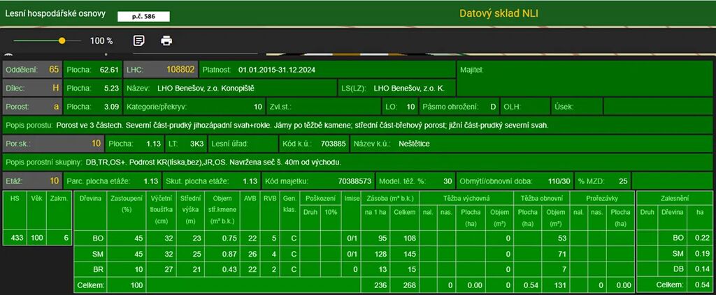 dále p.č. 586 vedená jako lesní pozemek o celkové výměře 13 092 m2, vlastníme podíl 1/8 tudíž 1 637 m2.