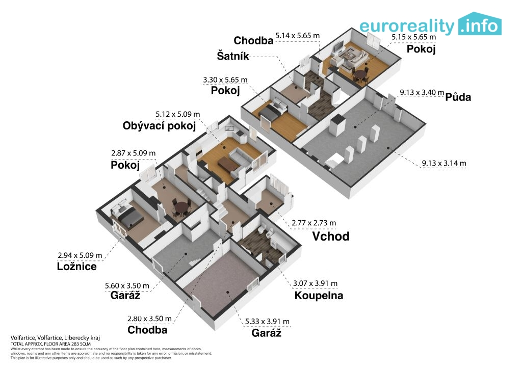 1. patro: pracovna, chodba, šatna a pokoj – možnost využití i jako dětské či hostinské pokoje.