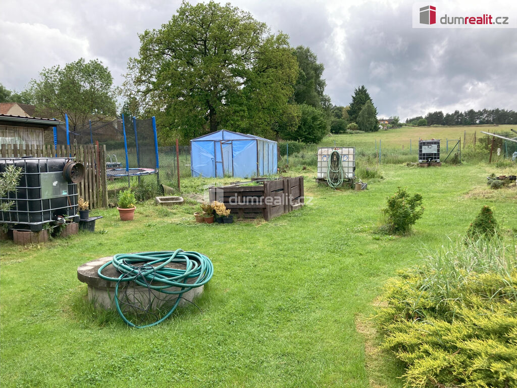 K domu patří zahrada s několika ovocnými stromy, keři a vodovodním vrtem.