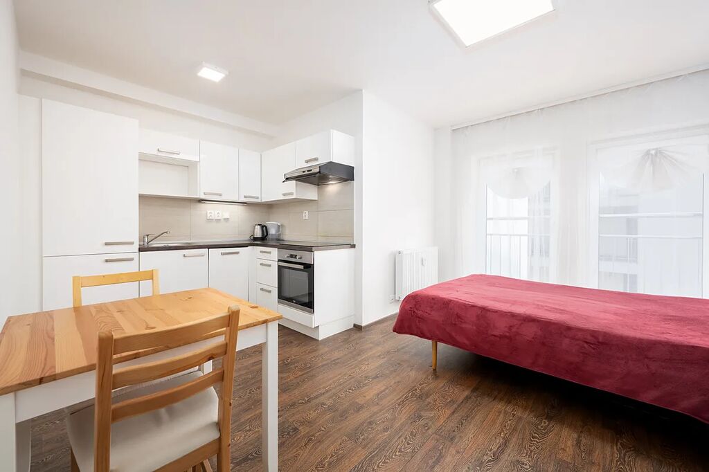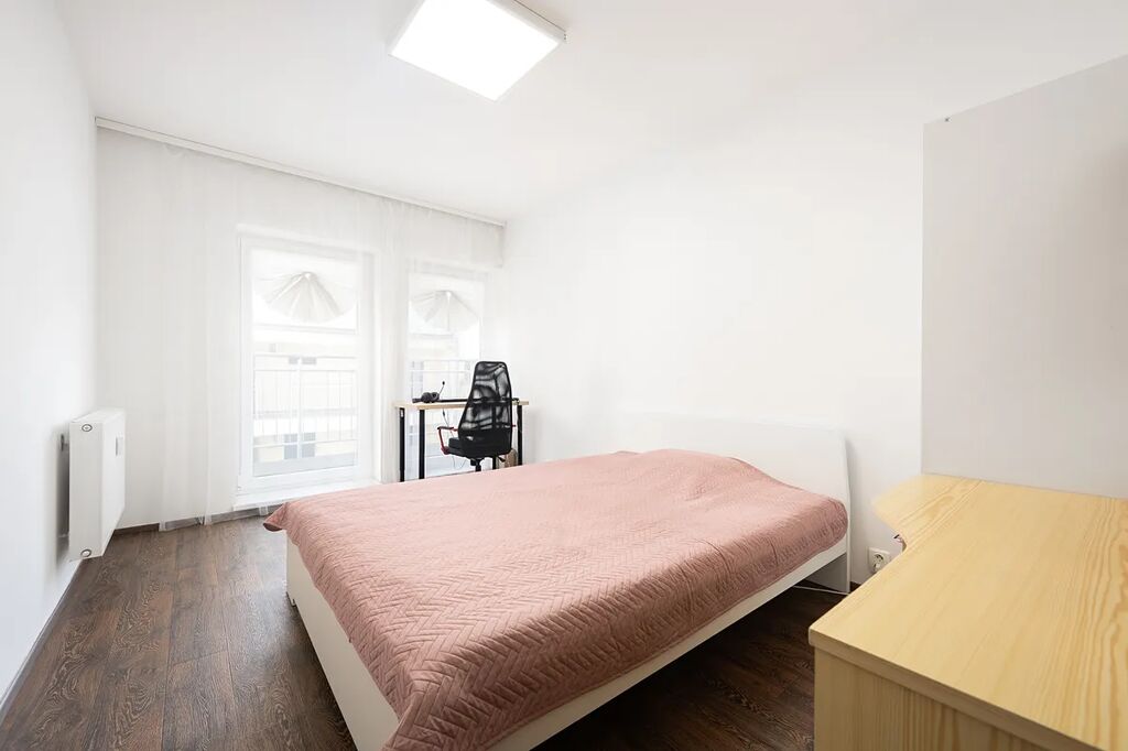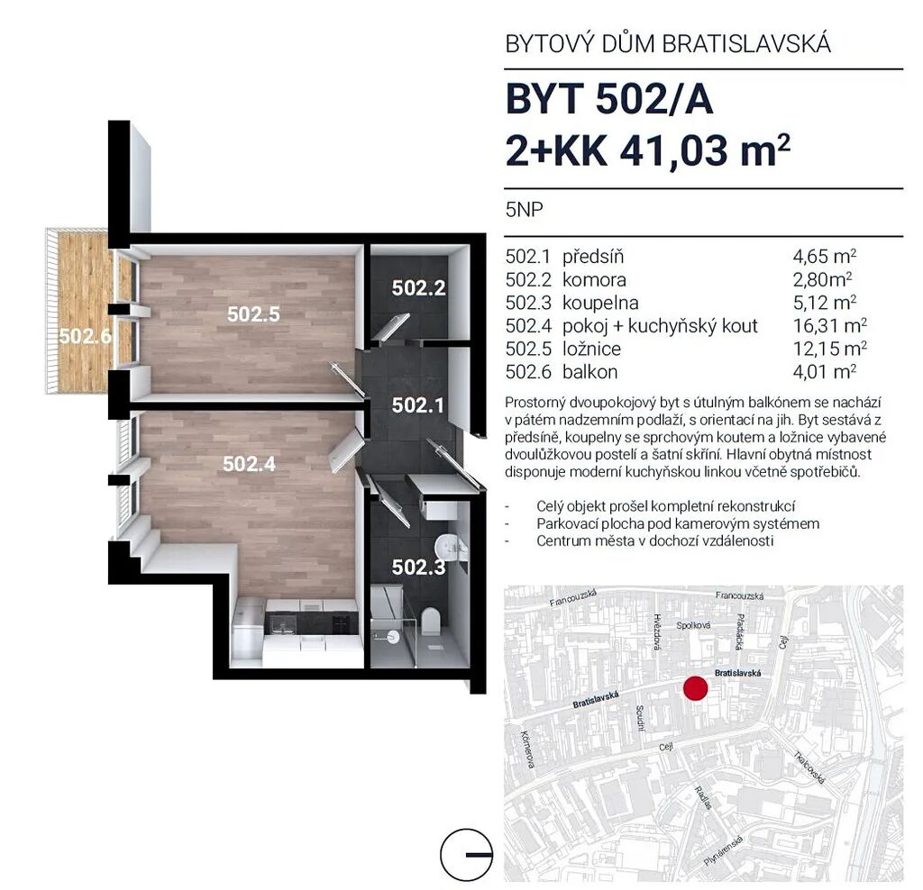 Nabízíme k pronájmu světlý byt 2+kk, který se nachází v novostavbě z roku 2017. Byt o rozloze 41 m² a balkonu 4m2 se nachází v 5.NP domu s výtahem, což zajišťuje pohodlný přístup a moderní standard bydlení. Nemovitost je částečně vybavená. V bytě je prostorná komora/šatna, která zajišťuje dostatek místa pro uskladnění věcí. Dům je umístěn v komplexu složeného ze 2 budov, které tvoří zabezpečený vnitroblok. Do vnitrobloku lze vejít z ulice Bratislavská.