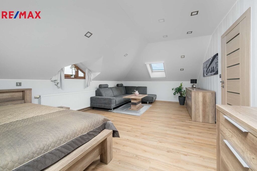 - Všechna okna jsou plastová – dvojsklo, opatřená žaluziemi. Střešní okna Velux, posuvné dveře na terasu (HS portál, provedení hliník).