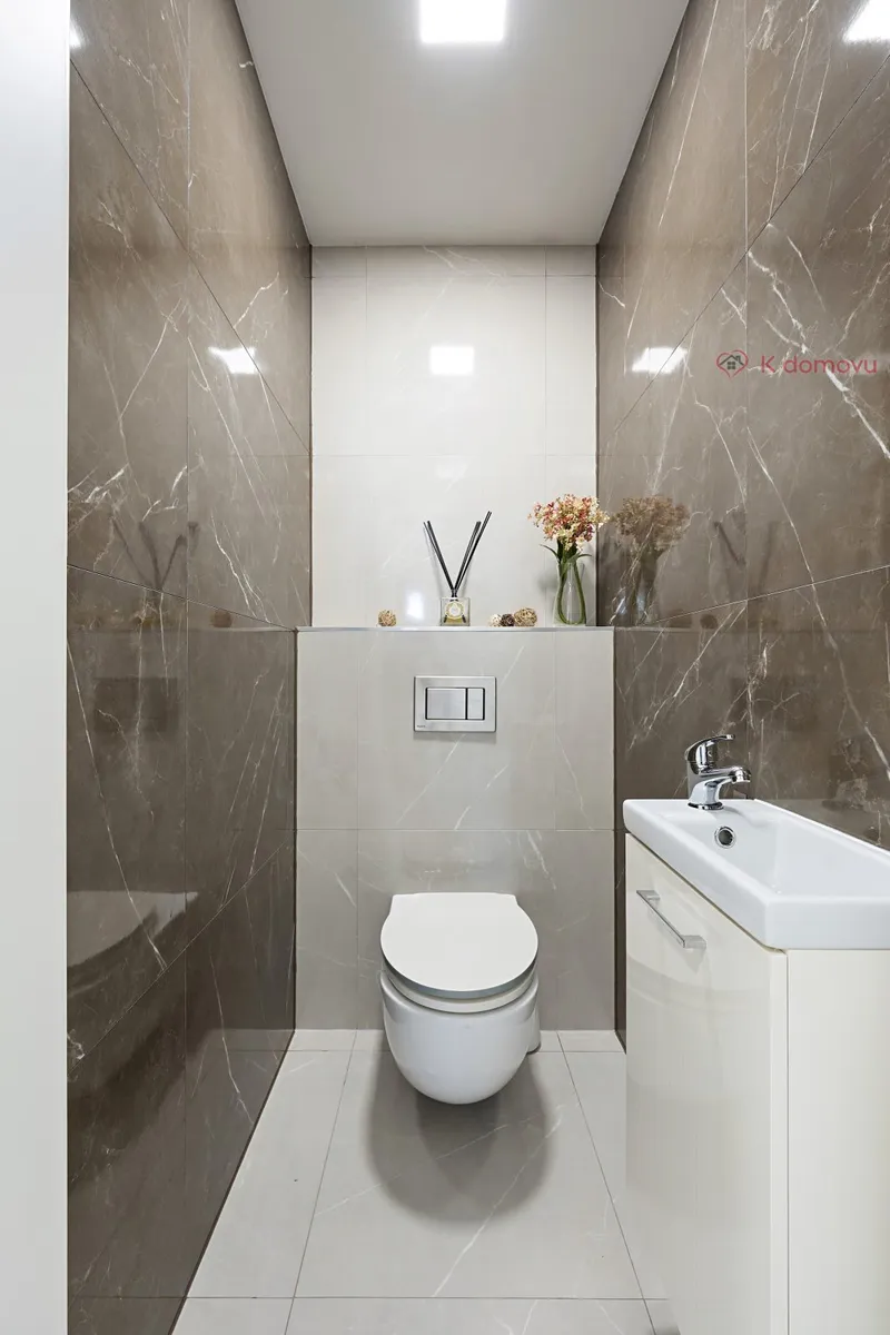 Koupelna je vybavena vanou, umyvadlem, toaletou, a také prostorem na pračku. Samostatné WC je v tomto případě určitým bonusem a prostor pro uložení věcí nabízí praktická šatna.