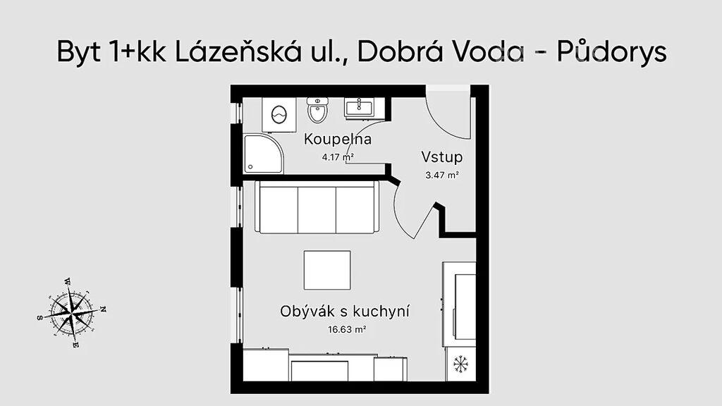 Dispozice bytu zahrnuje vstup, Obývacím pokojem s kuchyňským koutem, koupelnu se sprchovým koutem, umyvadlem, prostorem pro pračku a WC. Tepelný komfort v bytě zajišťuje ústřední vytápění. Celý byt je orientovaný na jih do dvora.