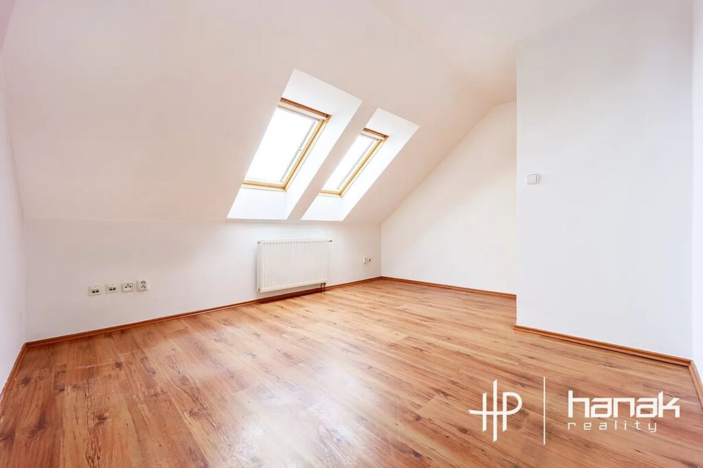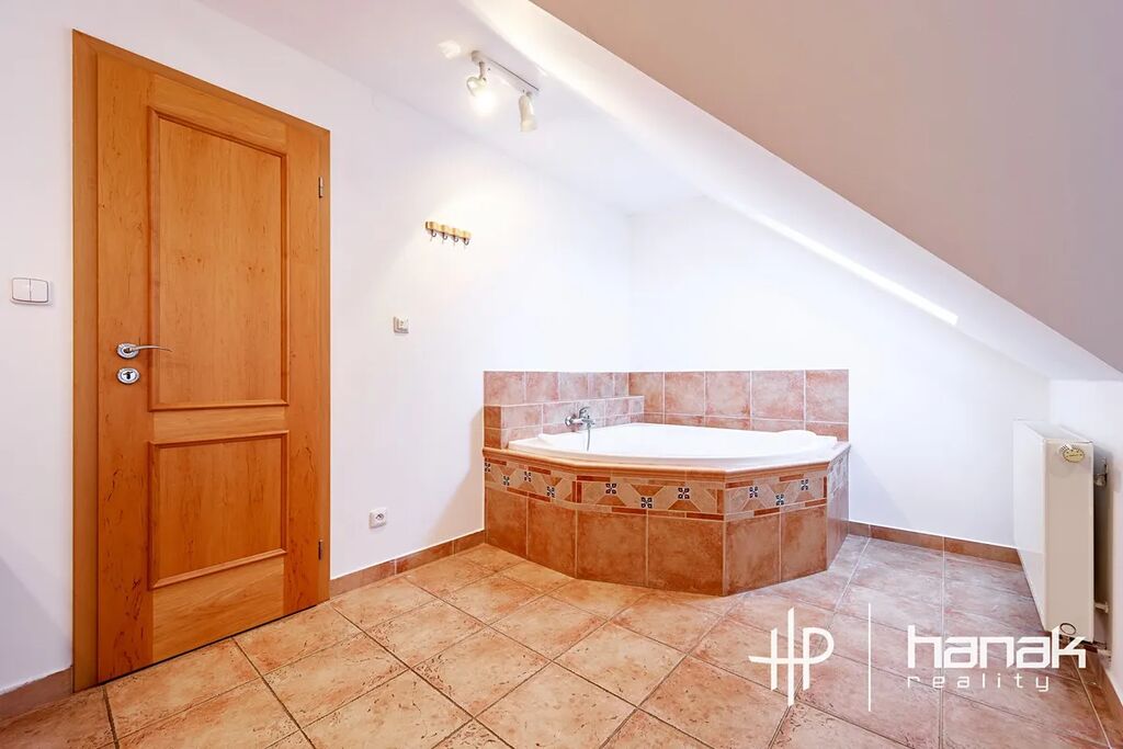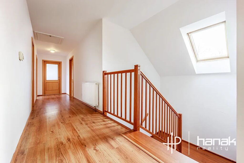 Po schodišti s masivními schodnicemi se dostanete do obytného podkroví. Dispozice zde nabízí možnost užívání jako prostorný 4+1, nebo v případě komerčního využití další tři kanceláře s krbem.