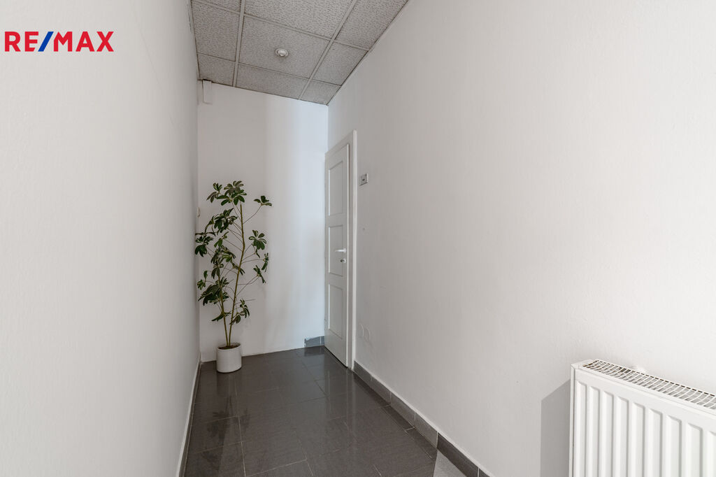 Jednotka je tvořena rozlehlým víceúrovňovým vstupním prostorem s recepcí (33,5 m2), samostatnou kanceláří (23,5 m2), kuchyňským koutem (3 m2) přístupným z prostorné chodby (16,4 m2), ze které je dále přístup na dvě oddělené toalety (2,4 m2 a 3 m2). Prostor s recepcí je situován směrem k magistrále, kancelář má výhled do klidného vnitrobloku; okna opatřena žaluziemi.