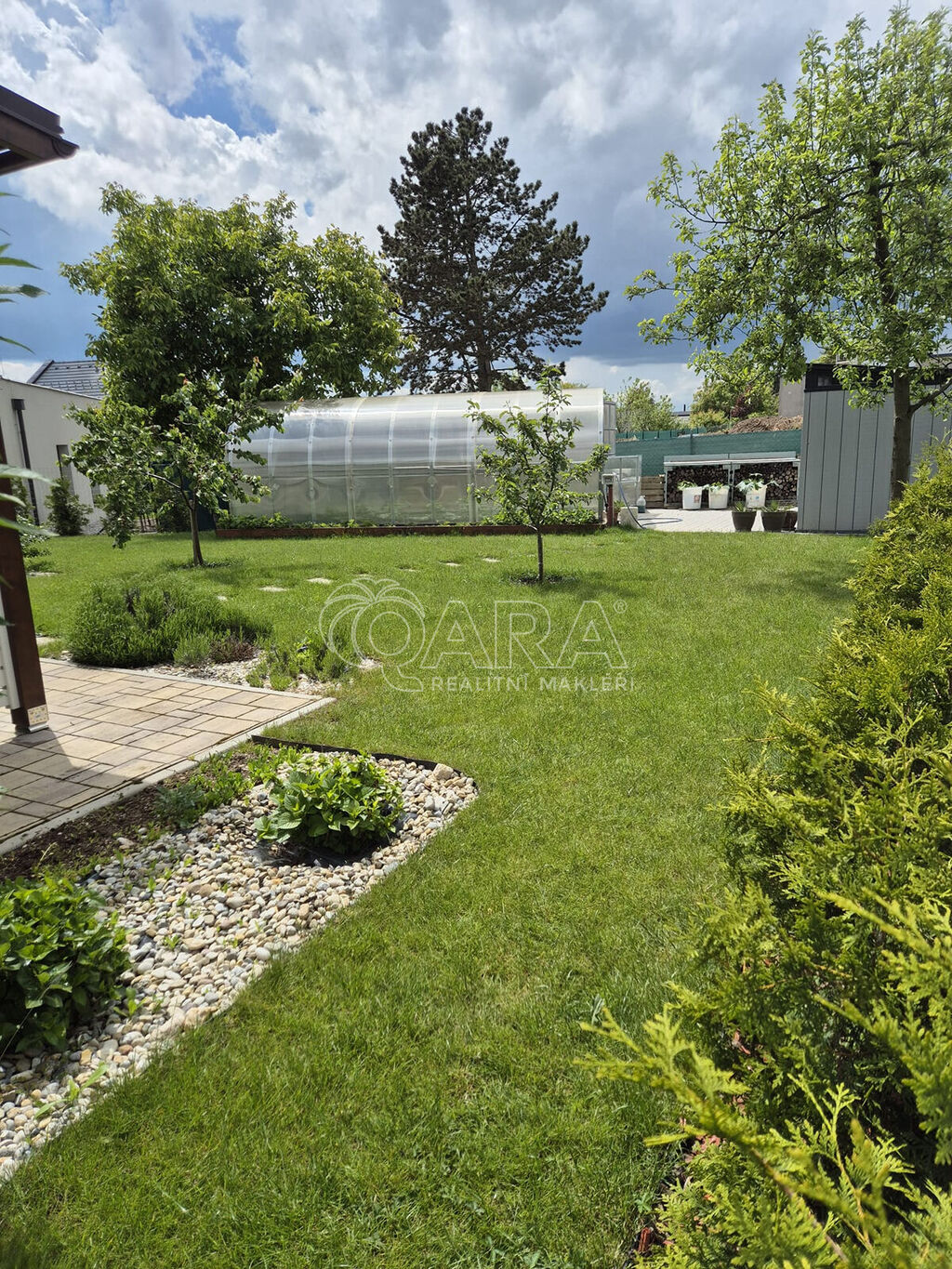 Zahrada je vybavena terasou s pergolou, na západní části zahrady se nachází zahradní domek a skleník. Dešťová voda je svedena do nádrží 6 m3 a uchována pro zálivku.