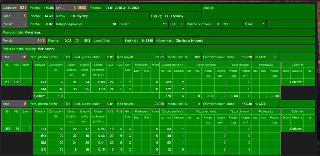 p.č. 1932/28 vedená jako lesní pozemek o celkové výměře 188 m2, hlavní zastoupení dřevin dle LHO borovice a smrk, stáří lesa 85 a 168 let.