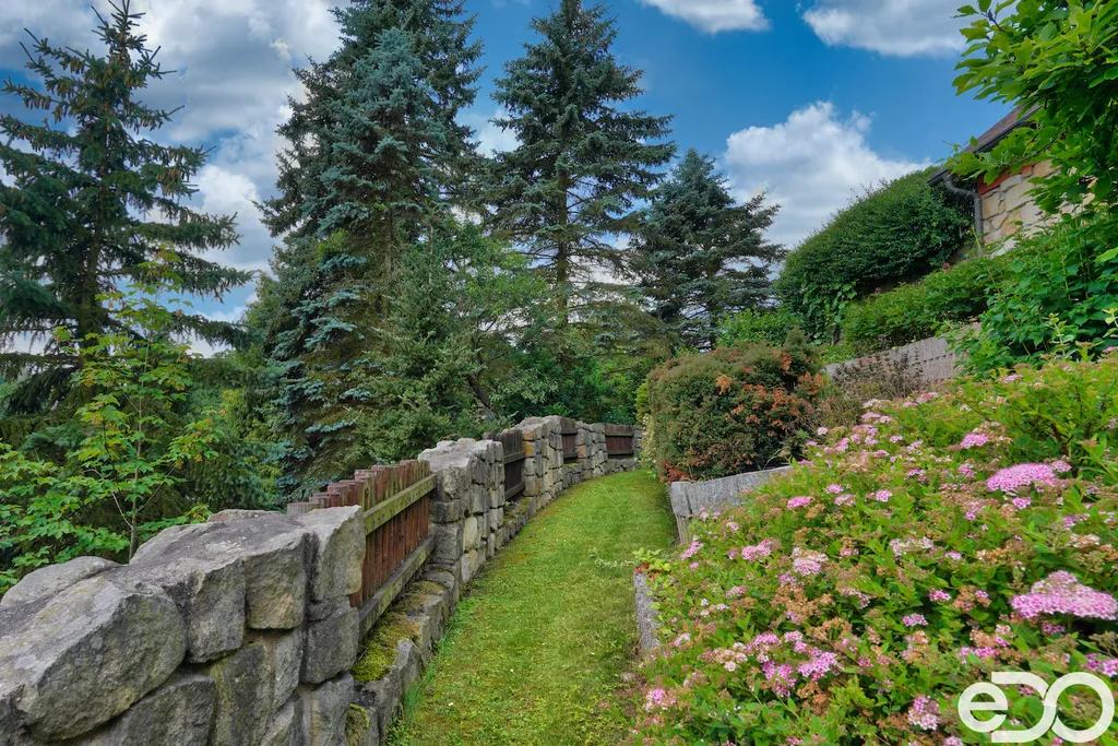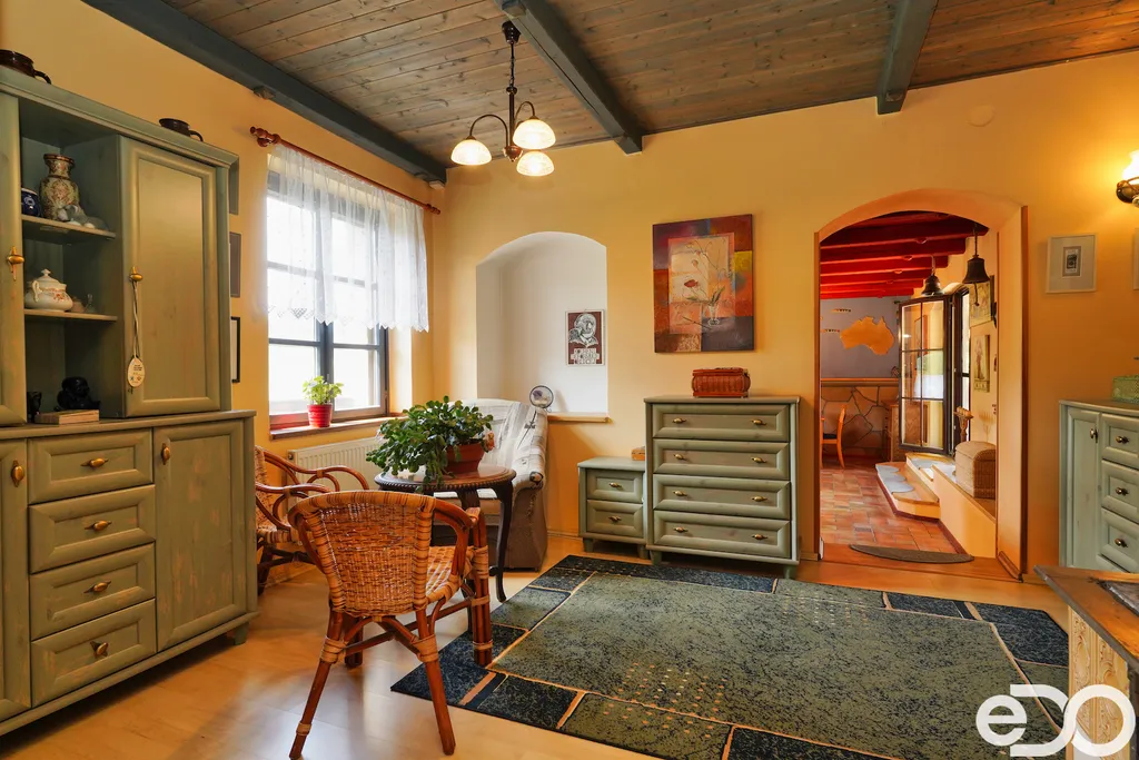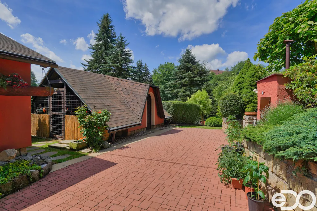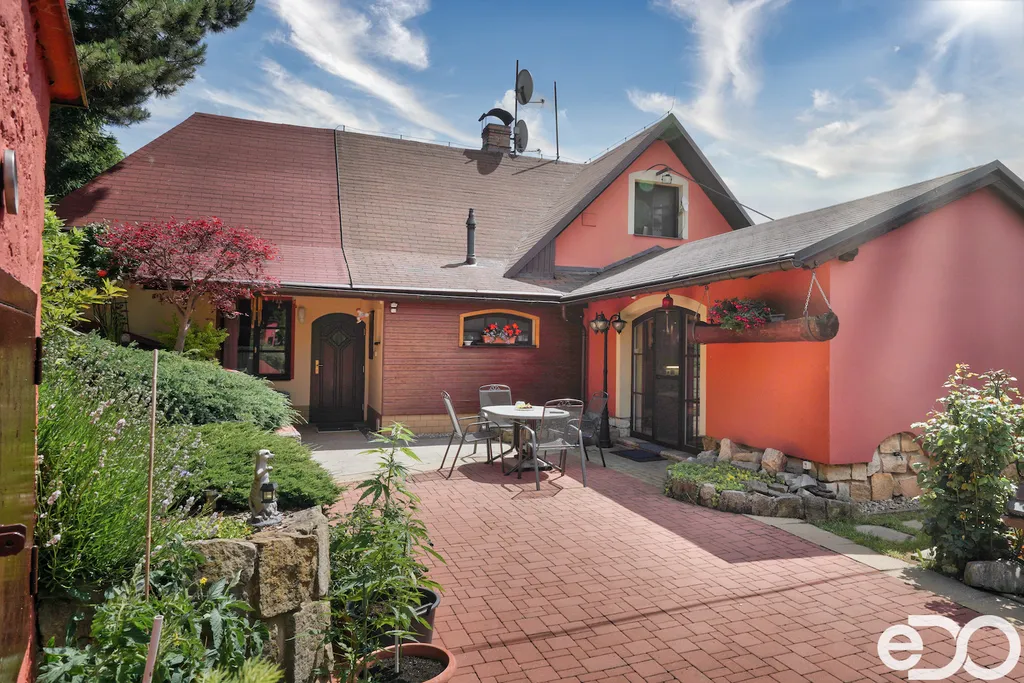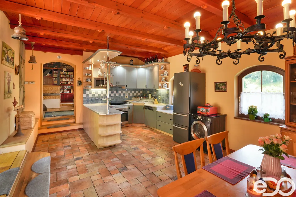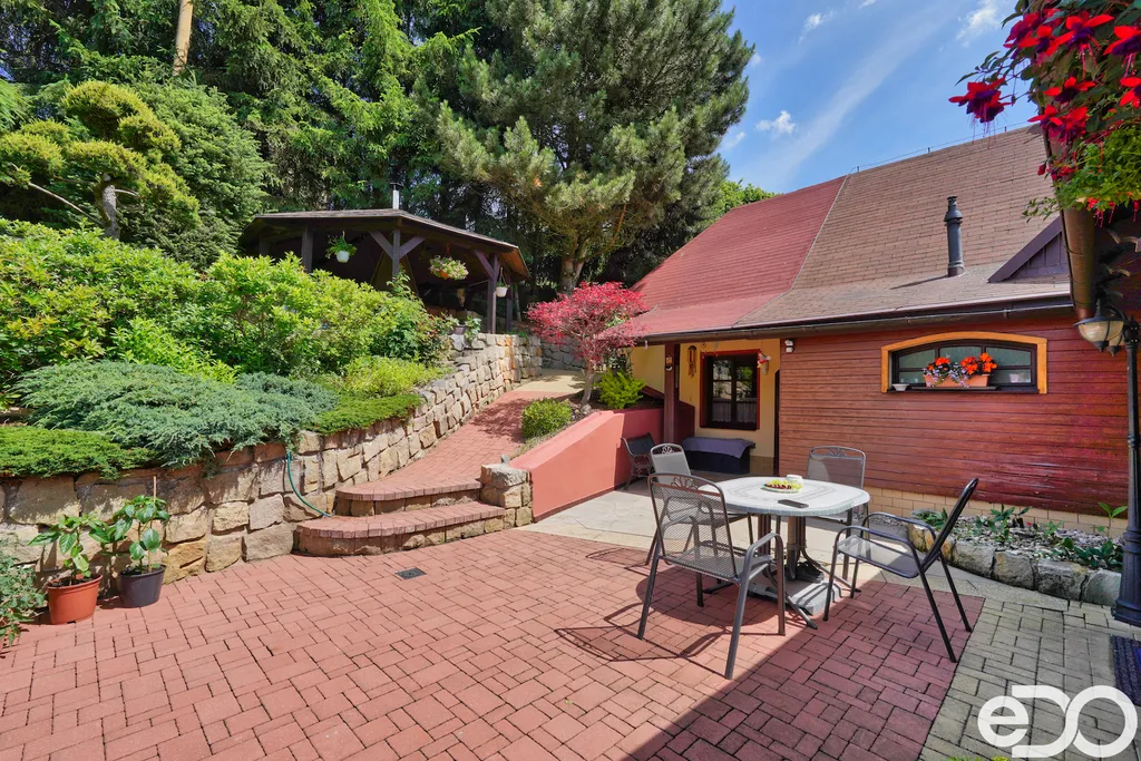 ZLEVNĚNO. V exkluzivním zastoupení nabízím k prodeji rodinný dům umístěný v intravilánu obce Radeč nedaleko města Úpice. Ač se dům nachází nedaleko hlavní silnice, jeví se jako oáza klidu a pohody. Dům postaven ze základního stavebního materiálu a tím je kámen. Pevný, jistý a všestranný kámen vévodí v této nemovitosti obložením stavby. Stavba na bydlení a členitá zahrada-opečována pečlivou majitelkou. Vstupujeme branou na dálkové ovládání na příjezdové cestě, která vede do kopce až k obytné části domu. U kované brány je dvojitá garáž taktéž na dálkové ovládání - z toho vyplývá, že v zimním období není váš automobil pod obyčejným přístřeškem ale v teplotním komfortu. Travnaté plochy jsou pravidelně sekány a spojují několik odpočinkových a relaxačních zón. V pravo, cestou vedoucí za dům se nachází dřevník, sklad a plynová nádrž, která je jistotou nízkých nákladů na dům v zimním období. Na straně levé najdeme chodníky vedoucí k nejoblíbenější části celé nemovitosti-bazénu o hloubce 1.6m a délce 4m se stavbou pro pozvané hosty, kteří tu mohou i přespat. Dominantou této části je krásné jezírko s rybičkami. Vrátíme-li se od bazénu zpět k domu, potkáte cestou záhonky, tuje, smrkový porost, udírnu a dalším napojovacím chodníčkem se dostanete k luxusní pergole pro 10-20osob. Opačným směrem od bazénu se dostanete k dílně, která je obložená OSB deskami, skladem pro různá nářadí, která potřebujete nezbytně k udržování zahrady, bazénu a nakonec i domu. Hlavní budova kde jsou nejvíce obývané části a to kuchyně s podlahovým topením, obývací pokoj s velkou knihovnou a s krásným historický kachlovým krbem. Okna oblouková, dřevěné trámy na stropě, kovaný lustr jasně prozradí, že stojí za to tuto nemovitost vidět osobně! Z obývacího pokoje se dostanete na chodbu v nichž najdete koupelnu, masážní sprchový kout, záchod a úložný prostor. Po dřevěných schodech do patra najdete další 3 pokoje s krásnými výhledy do okolí! Toaletu a kancelář. Pokud vás nemovitost zaujala, zavolejte, myslím že na trhu se dlouho neohřeje!
