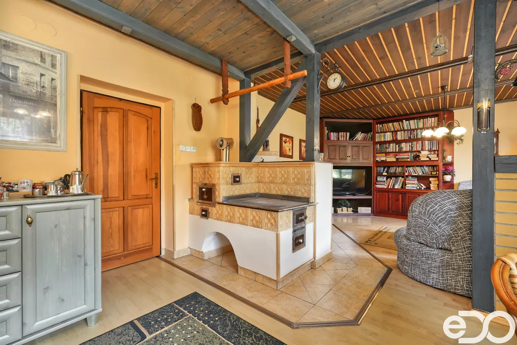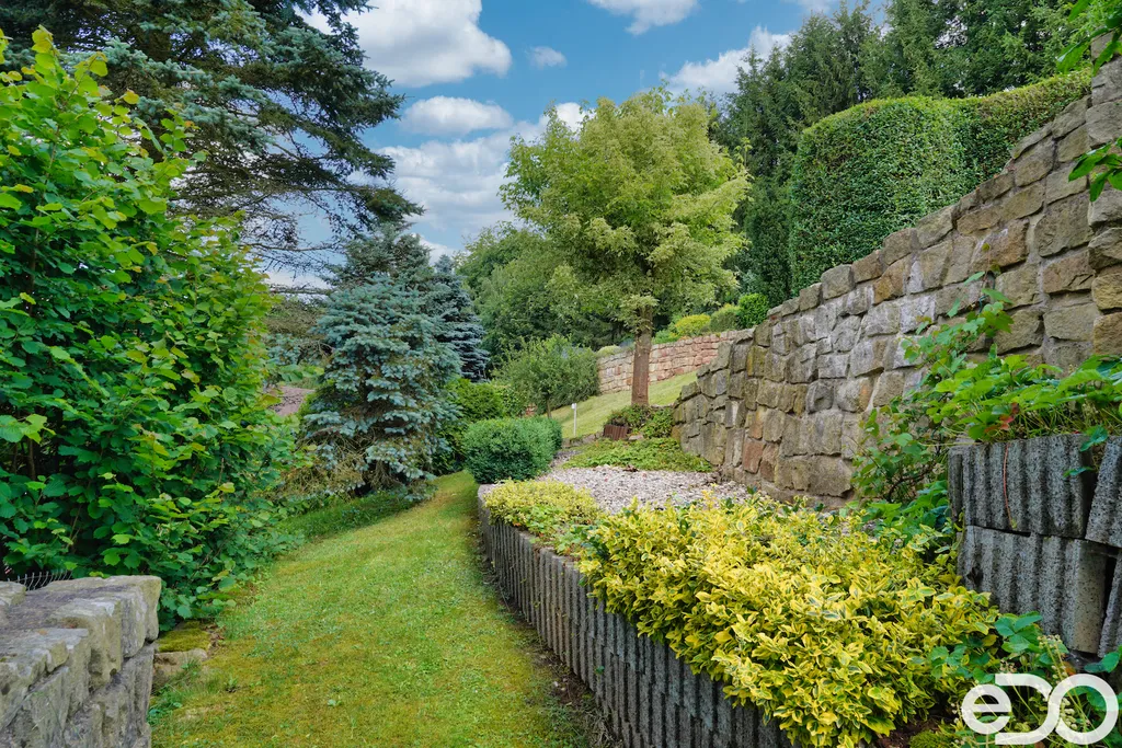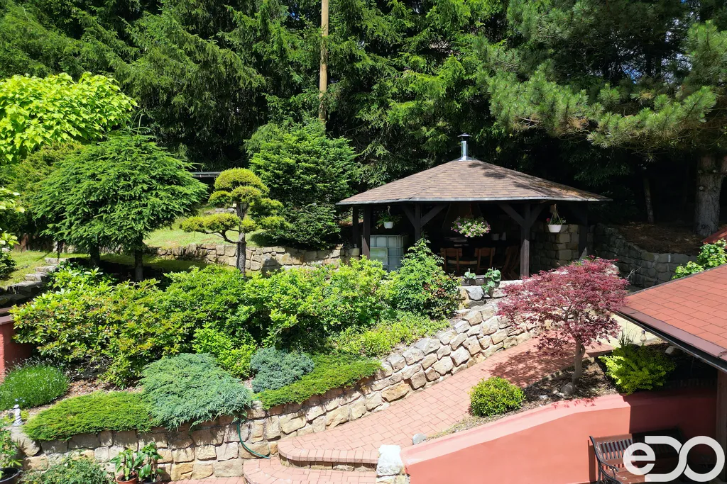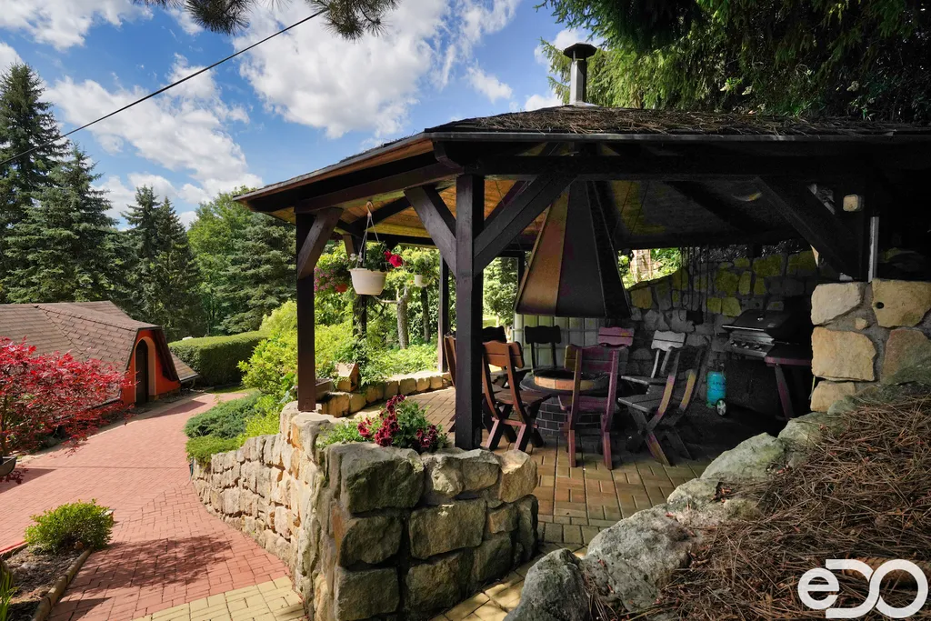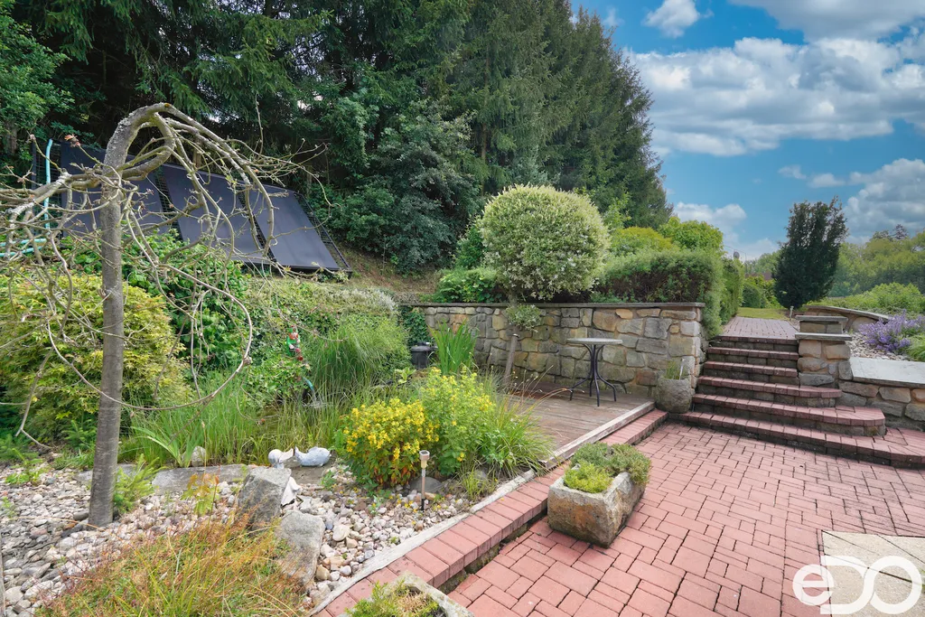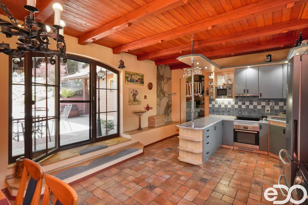ZLEVNĚNO. V exkluzivním zastoupení nabízím k prodeji rodinný dům umístěný v intravilánu obce Radeč nedaleko města Úpice. Ač se dům nachází nedaleko hlavní silnice, jeví se jako oáza klidu a pohody. Dům postaven ze základního stavebního materiálu a tím je kámen. Pevný, jistý a všestranný kámen vévodí v této nemovitosti obložením stavby. Stavba na bydlení a členitá zahrada-opečována pečlivou majitelkou. Vstupujeme branou na dálkové ovládání na příjezdové cestě, která vede do kopce až k obytné části domu. U kované brány je dvojitá garáž taktéž na dálkové ovládání - z toho vyplývá, že v zimním období není váš automobil pod obyčejným přístřeškem ale v teplotním komfortu. Travnaté plochy jsou pravidelně sekány a spojují několik odpočinkových a relaxačních zón. V pravo, cestou vedoucí za dům se nachází dřevník, sklad a plynová nádrž, která je jistotou nízkých nákladů na dům v zimním období. Na straně levé najdeme chodníky vedoucí k nejoblíbenější části celé nemovitosti-bazénu o hloubce 1.6m a délce 4m se stavbou pro pozvané hosty, kteří tu mohou i přespat. Dominantou této části je krásné jezírko s rybičkami. Vrátíme-li se od bazénu zpět k domu, potkáte cestou záhonky, tuje, smrkový porost, udírnu a dalším napojovacím chodníčkem se dostanete k luxusní pergole pro 10-20osob. Opačným směrem od bazénu se dostanete k dílně, která je obložená OSB deskami, skladem pro různá nářadí, která potřebujete nezbytně k udržování zahrady, bazénu a nakonec i domu. Hlavní budova kde jsou nejvíce obývané části a to kuchyně s podlahovým topením, obývací pokoj s velkou knihovnou a s krásným historický kachlovým krbem. Okna oblouková, dřevěné trámy na stropě, kovaný lustr jasně prozradí, že stojí za to tuto nemovitost vidět osobně! Z obývacího pokoje se dostanete na chodbu v nichž najdete koupelnu, masážní sprchový kout, záchod a úložný prostor. Po dřevěných schodech do patra najdete další 3 pokoje s krásnými výhledy do okolí! Toaletu a kancelář. Pokud vás nemovitost zaujala, zavolejte, myslím že na trhu se dlouho neohřeje!