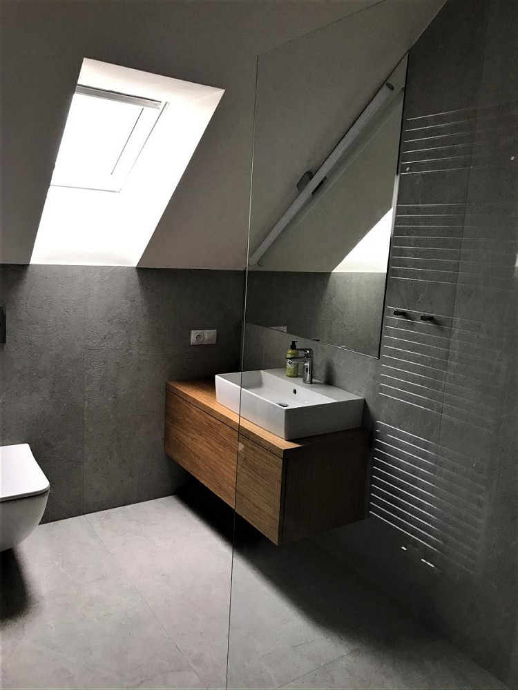 Podlahy: velkoformátová dlažba v koupelně, v ostatních místnostech PVC lamely v dekoru dřeva.