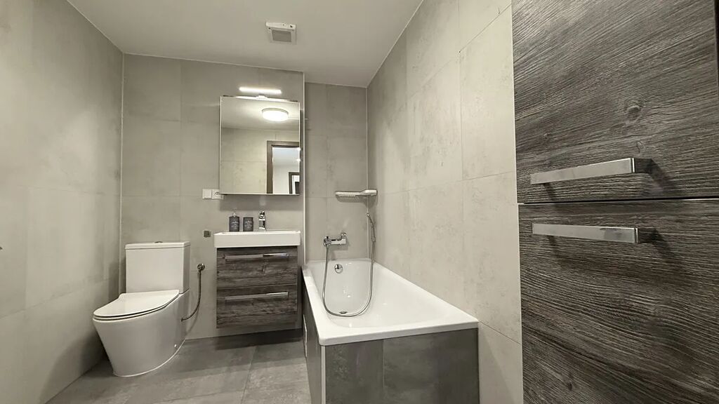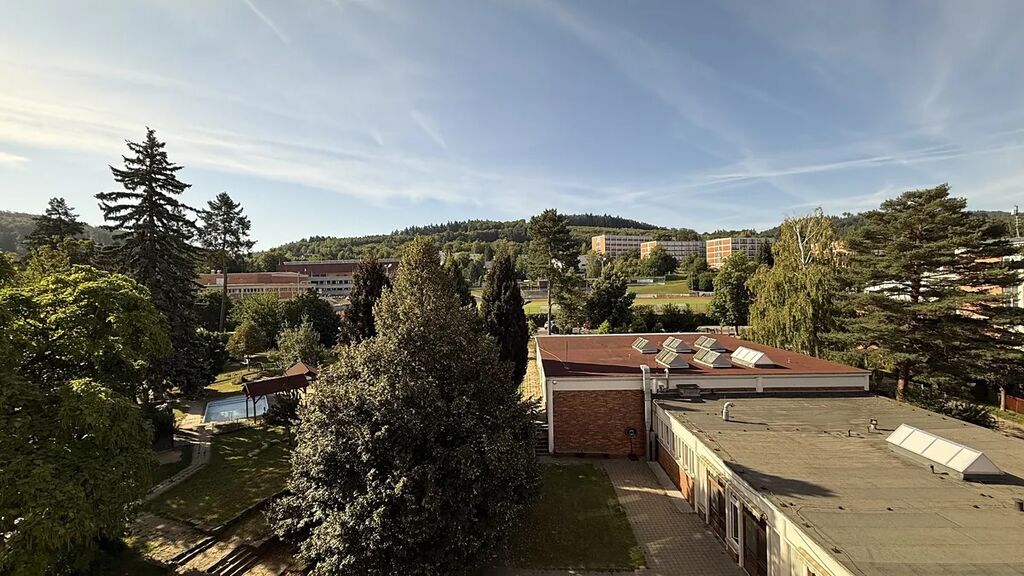 Kuchyně s obývacím pokojem je od klidových zón bytu a spojovací chodby, oddělena posuvnými dveřmi v pouzdru. Ložnice manželů ( 15 m2), s vestavěnými skříněmi , má pak přístup na balkón s klimatizační jednotkou. Odtud je velmi hezký výhled nejen na centrum města, ale zejména směrem k atletickému stadiónu, na zimní lázně a do lesů nad lyžařským svahem. Dětský pokoj ( 16m2), s rohovým prosklením, pak jen doplňuje celkový dojem z tohoto bytu, vzdušnost, všudy přítomné světlo a prostor. Každý člen rodiny má tak svůj vlastní prostor a místo, aby nebyl rušen ostatními.