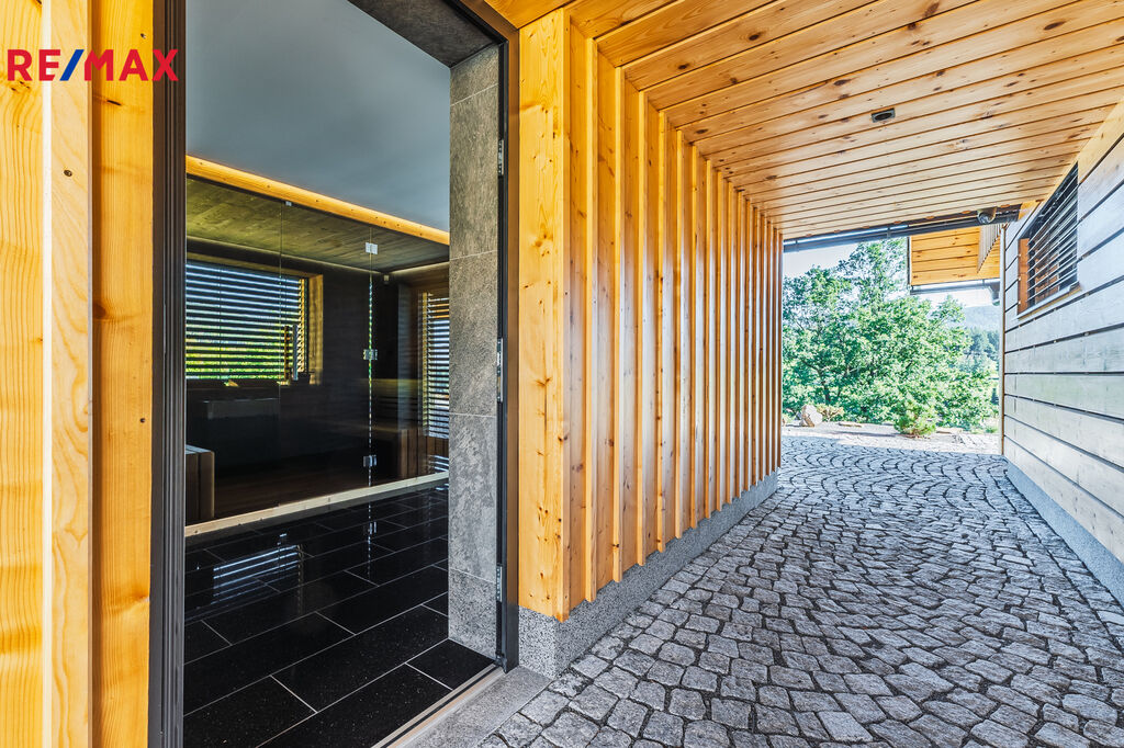 Přízemí: velkorysý prosklený obývací pokoj s krbovými kamny, wellness se saunou a odpočívárnou, koupelna, zádveří, technická místnost, zahradní sklad