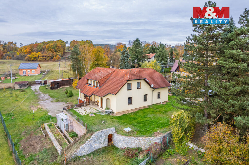 Nabízíme k prodeji velmi zajímavý, dvougenerační rodinný dům, v klidné části obce Hřiměždice. Jedná se o vyhledávanou lokalitu, v těsné blízkosti vodní nádrže Slapy. Tento cihlový dům z přelomu tisíciletí s užitnou plochou 335 m² nabízí prostorné dispozice: v přízemí 5+kk s přímým vstupem na terasu, v patře 4+kk s úchvatným výhledem na Slapskou přehradu. Nemovitost je v původním a průběžně udržovaném stavu. Dům je podsklepen, má velkou garáž, kotelnu s novým kotlem na dřevo a dílnu. Na pozemku o rozloze 2606 m² se nachází menší stáje pro koně, zázemí pro hospodářská zvířata, skleník a místo pro pergolu. Na pozemku lez pohodlně zaparkovat šest vozidel. Dům je napojen na vlastní studnu a vyvážecí jímku. Dostupnost do Prahy 50 minut, Příbram 20 minut, Sedlčany 15 minut. Pro více informací a sjednání prohlídky kontaktujte našeho makléře. S financováním vám rádi pomůžeme.