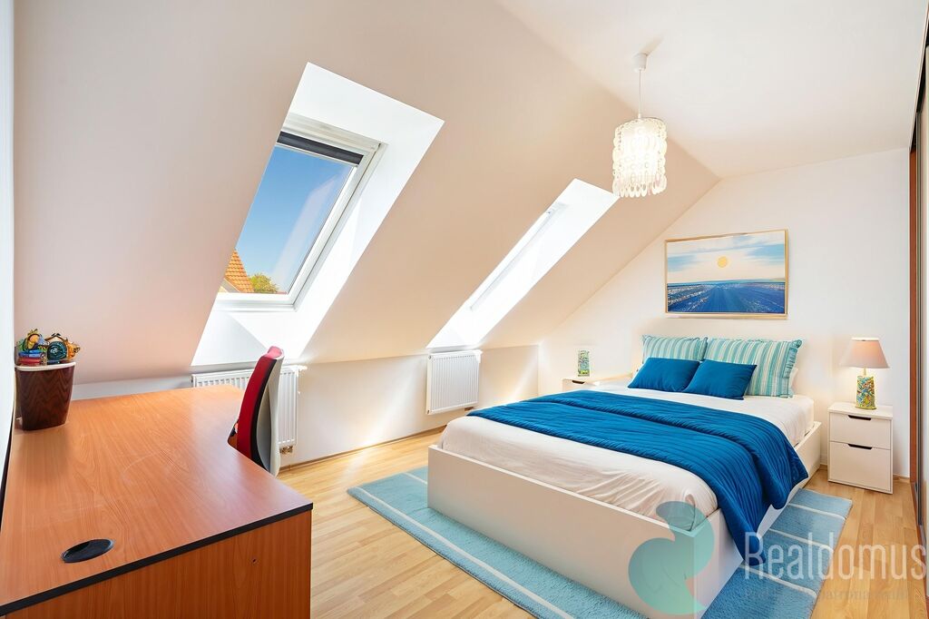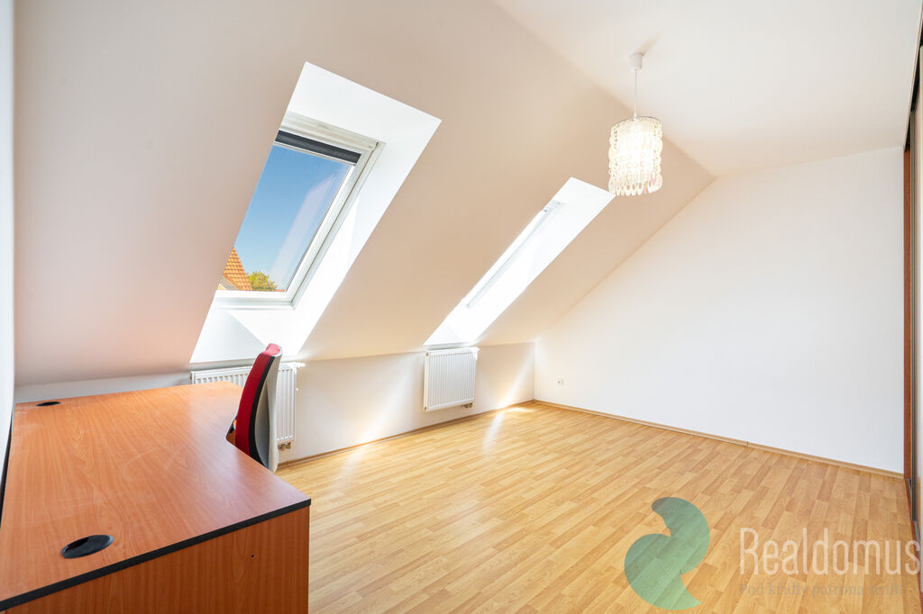 Byt se nachází ve druhém patře/podkroví malého zděného domu a nabízí komfortní a klidné bydlení s výbornou dostupností do města. Dispozičně je byt velmi prakticky řešen, najdeme zde velkorysý obývací pokoj s moderním kuchyňským koutem (31,6 m²), dvě ložnice (19,7 m² a 15,63 m²), koupelnu s vanou (4,4 m²), samostatnou toaletu (1,87 m²) a předsíň (7,7 m²). Kuchyňská linka je vybavena troubou, varnou deskou, digestoří a mikrovlnnou troubou.